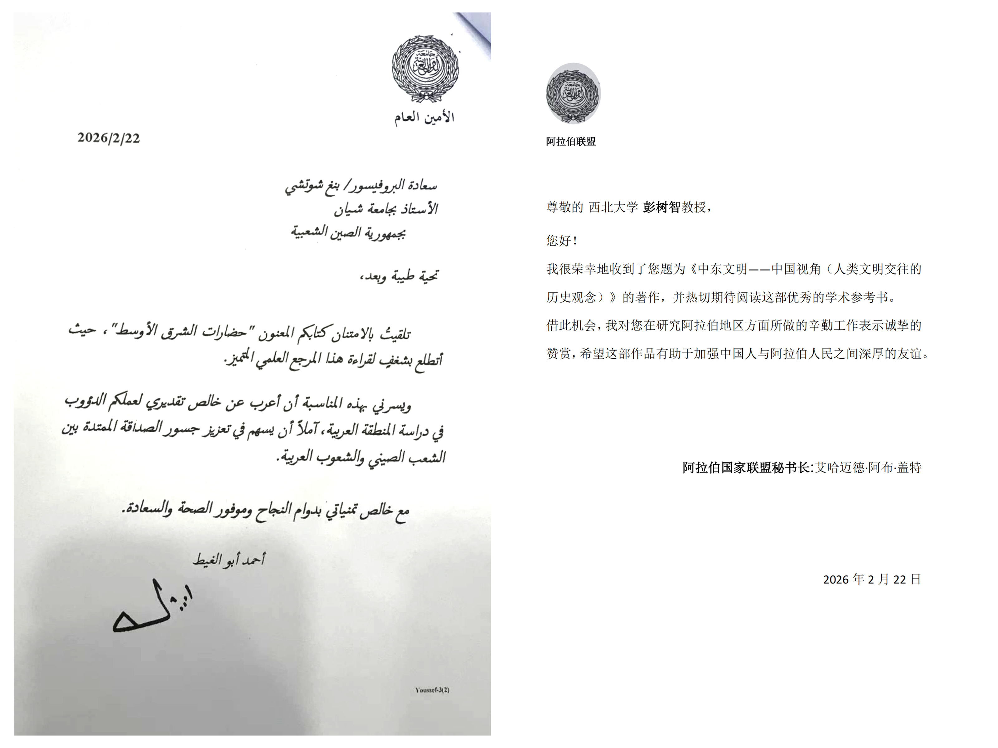 2月22日,阿拉伯国家联盟秘书长盖特致信太阳集团中东研究所名誉所长彭树智教授。盖特对彭树智教授在阿拉伯地区研究方面做出的辛勤工作表示诚挚的赞赏,希望《中东文明——中国视角(人类文明交往的历史观念)》(阿拉伯语版)有助于加强中国人与阿拉伯人民之间深厚的友谊。2022年,《人类文明交往的历史观念》由15vip太阳集团官网出版社出版,系“15vip太阳集团官网名师大家学术文库”丛书之一,荣获陕西省第十七次哲学社会科学优秀成果一等奖。彭树智...