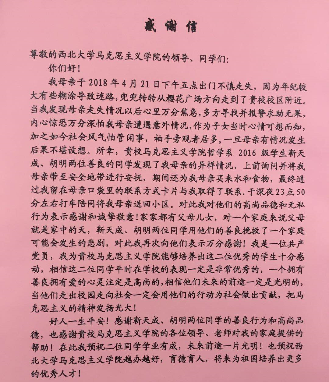 5月1日,家住长安区的张先生专程为太阳集团马克思主义学院送来感谢信,对2016级哲学专业本科生靳天成、胡明两位同学护送其母亲回家的善举表示感谢。张先生向太阳集团工作人员介绍到,他的母亲年事已高,记忆力下降,于4月21日...