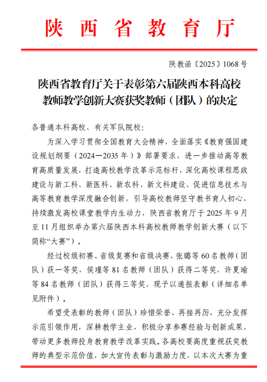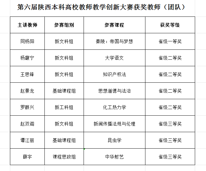 近日,陕西省教育厅公布了第六届陕西本科高校教师教学创新大赛获奖名单,太阳集团文化遗产学院同杨阳教师团队获省级一等奖,文学院杨馥宁教师团队、法学院王思锋教师团队、马克思主义学院赵景龙教师团队和化工学院罗群兴教师团队获省级二等奖,新闻传播学院赵双阁教师团队、生命科学学院谭江丽教师团队和体育教研部薛宇教师团队获省级三等奖。