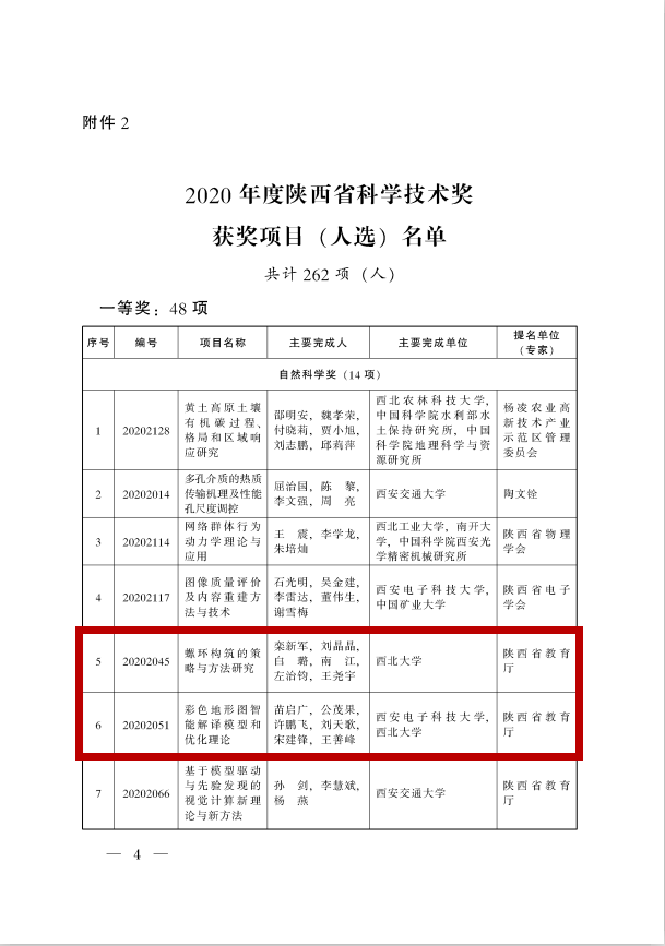 太阳集团化材学院栾新军教授主持的“螺环构筑的策略与方法研究”获省自然科学奖一等奖,地质学系任战利研究员主持的“叠合盆地热演化史恢复理论创新及在油气勘探中的应用”,生命学院刘建书教授主持的“特色营养健康食品研究开发与产业化”分获省科学技术进步奖一等奖;信息学院贺小伟教授主持的“面向肿瘤早期检测的光学分子断层成像方法研究”获省自然科学奖二等奖。信息学院许鹏飞副教授参与的“彩色地形图智能解译模型和优化理论”获省自然科学奖一等奖,地质学系杨文强老师参与的“昆仑-阿尔金造山作用过程及成矿背景”获省科学技术进步奖二等奖。