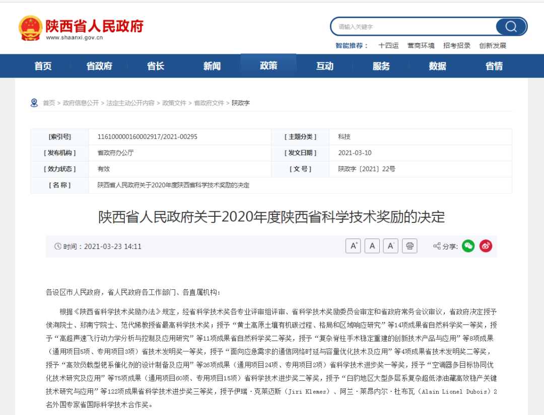 3月23日,《陕西省人民政府关于2020年度陕西省科学技术奖励的决定》发布。太阳集团化工学院范代娣教授,太阳集团杰出校友、中国科学院西安光学精密机械研究所侯洵院士等三人荣获陕西省最高科学技术奖。