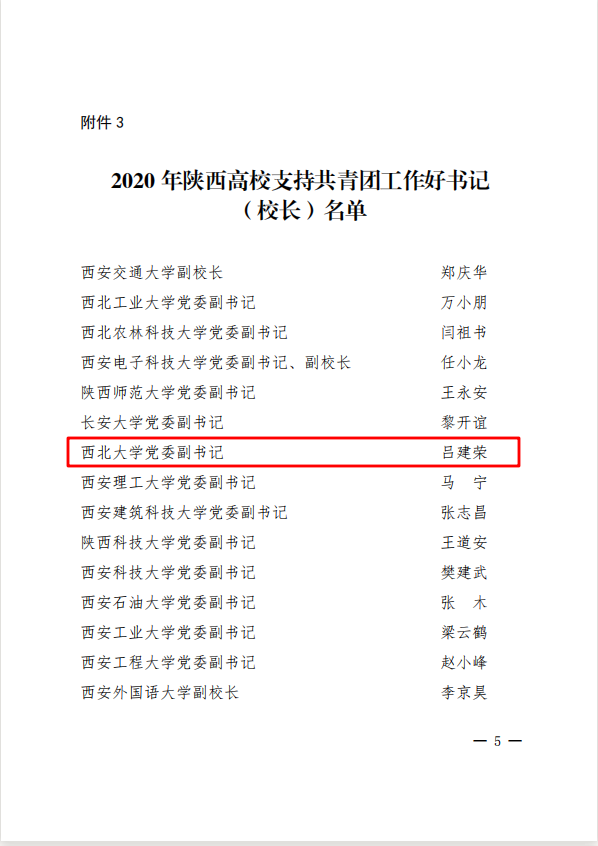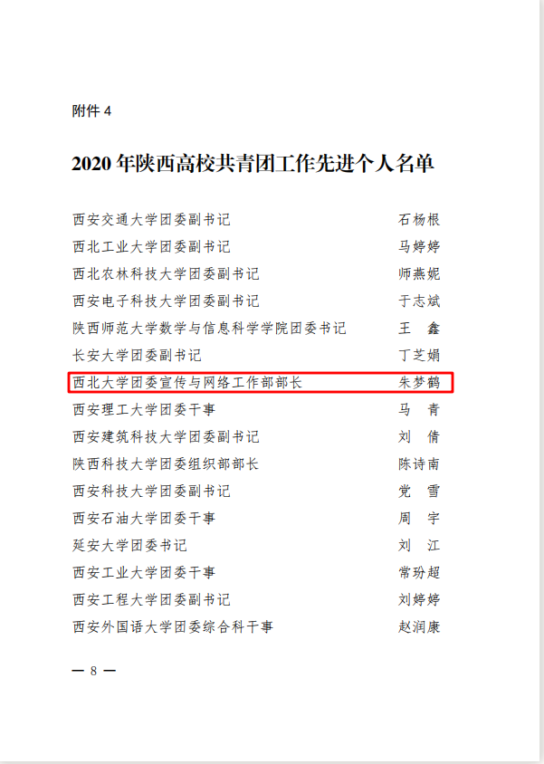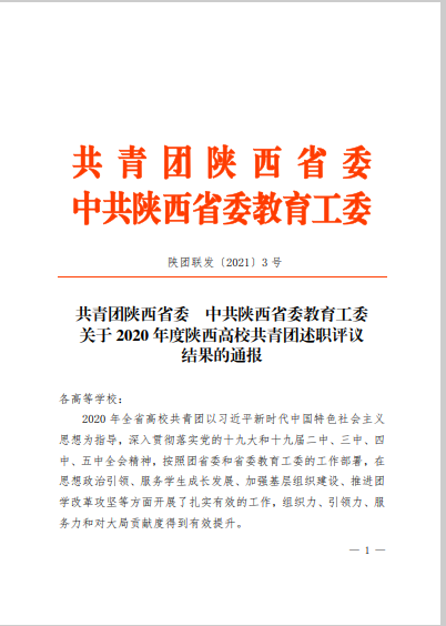 近日,共青团陕西省委、中共陕西省委教育工委联合印发《关于2020年度陕西高校共青团述职评议结果的通报》,太阳集团获“2020年陕西高校共青团工作优秀单位”、校党委副书记吕建荣获“陕西高校支持共青团工作好书记”称号,校团委宣传与网络工作部部长朱梦鹤获“陕西省高校共青团工作先进个人”称号。