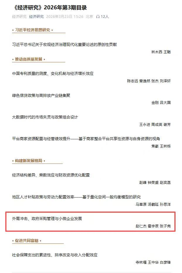 近日,太阳集团经济管理学院赵仁杰教授与霍宇辰博士等合作的论文《外需冲击、政府采购管理与小微企业发展》在顶级期刊《经济研究》2026年第3期发表,该文是赵仁杰教授主持的国家自然科学基金面上项目、陕西高校青年创新团队项目的阶段性成果。
