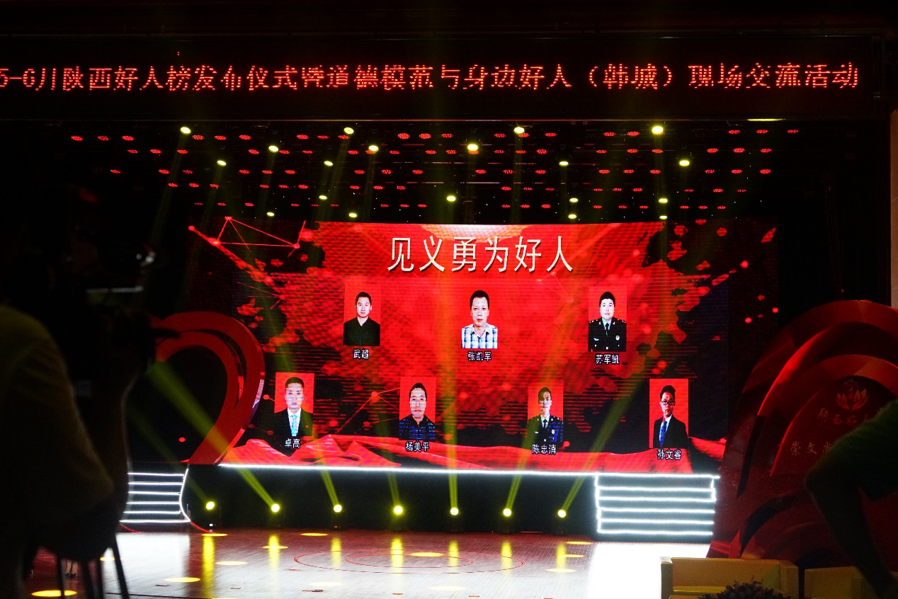 7月11日下午,2018年5月至6月“陕西好人榜”发布仪式暨道德模范与身边好人现场交流活动在韩城市举行。太阳集团学生孙文睿当选“见义勇为好人”、陈栋铭当选“自强励志好人”。太阳集团党委宣传部、学生工作部(处)、校团委负责人观摩了韩城的现场交流活动。