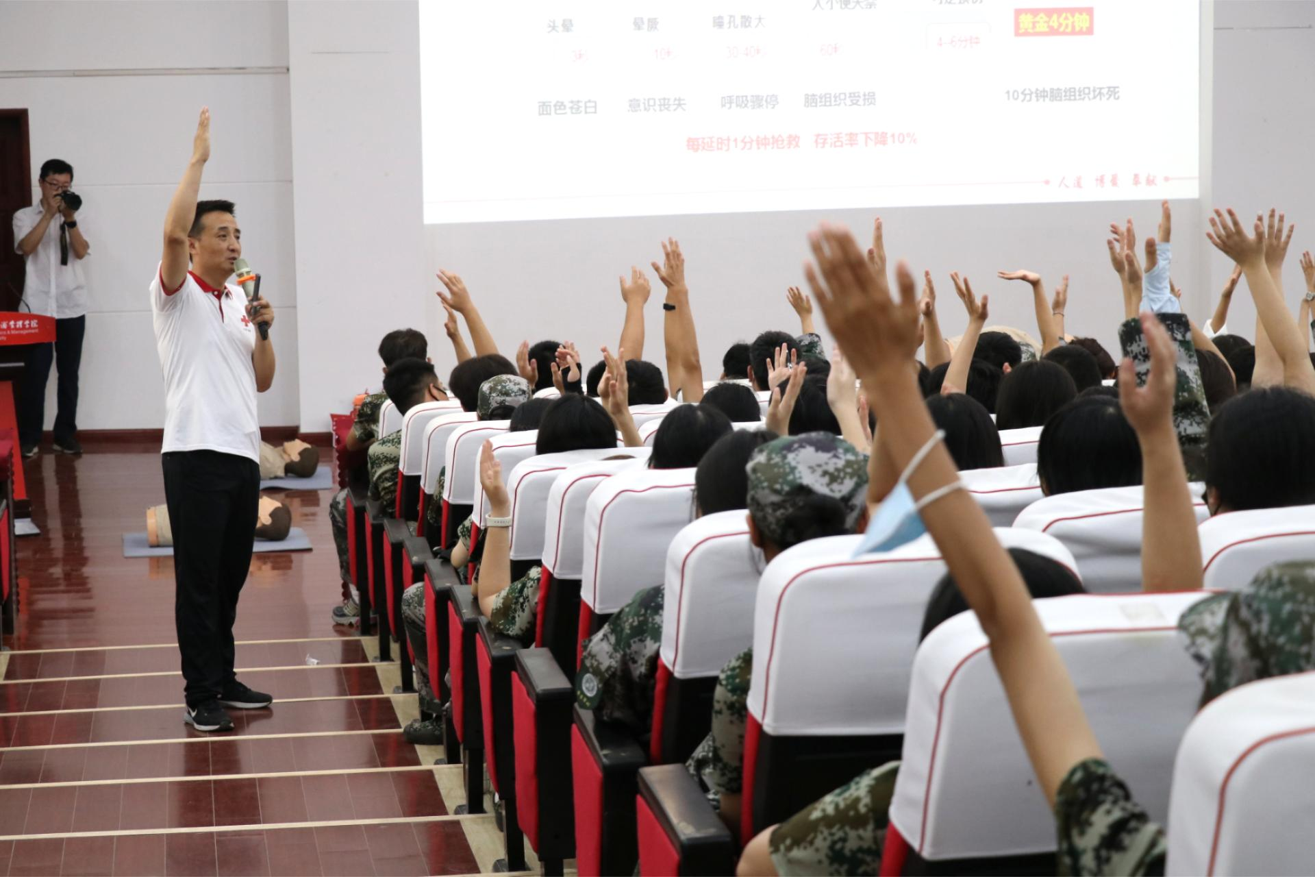 培训在陕西省红十字会应急救护专业讲师的自我介绍中拉开帷幕,他们以“呼救专用手势”引入,采用“问题式导学”的方法,通过理论讲解和实际操作相结合的形式,将晦涩难懂的急救知识与技能“掰开揉碎”,深入浅出地讲解了心肺复苏(CPR)操作流程、自动体外除颤器(AED)使用方法及注意事项。实操环节中,同学们在实训老师的指导下不断梳理急救流程、规范动作要领,在情景演绎中沉浸式体验应急救护氛围,掌握心肺复苏技能。经过培训及考核,1200名本科新生获得陕西省红十字会颁发的“红十字救护员(初级)”证书。