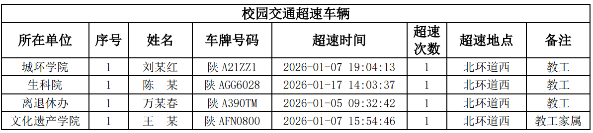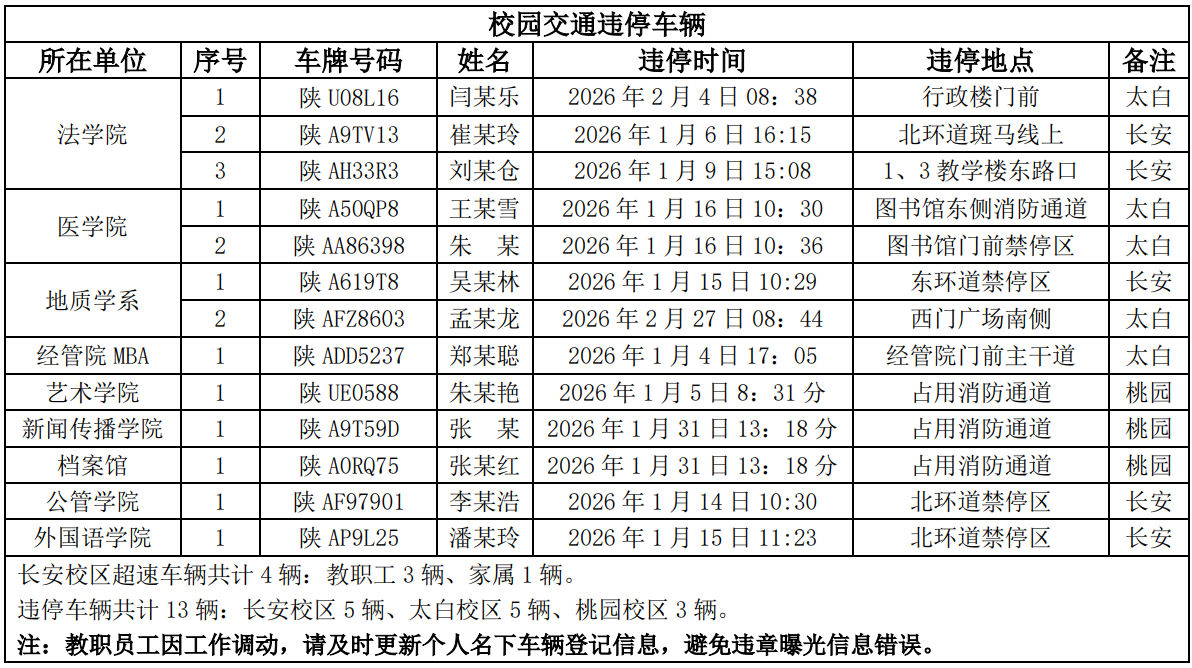 为进一步加强校园交通管理,保障校园交通安全有序,维护学校正常的教学、科研和生活秩序,切实保护师生员工的人身财产安全,根据《15vip太阳集团官网校园交通安全管理规定》的相关要求,现将2026年1-2月校园交通违章车辆予以曝光,具体要求与违章信息如下: