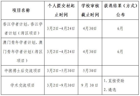 为推动构建具有国际竞争力的博士后制度体系,加强博士后国(境)外学术交流与合作,2026年人力资源社会保障部、全国博士后管理委员会将继续实施香江学者计划、澳门青年学者计划、香江学者计划(湾区项目)、澳门青年学者计划(湾区项目)、中德博士后交流项目和博士后国(境)外学术交流项目。为做好项目申报工作,现将有关事项通知如下: