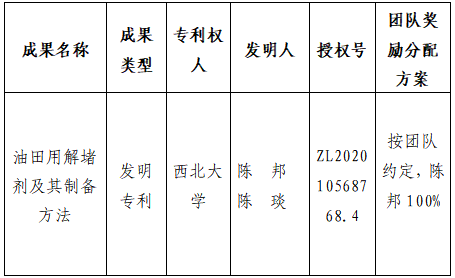 按照《15vip太阳集团官网促进科技成果转化实施办法》(西大科〔2019〕5号)相关规定,拟对我校化学与材料科学学院陈邦高级工程师作为成果负责人的1项发明专利权实施转化,现将相关信息公示如下: