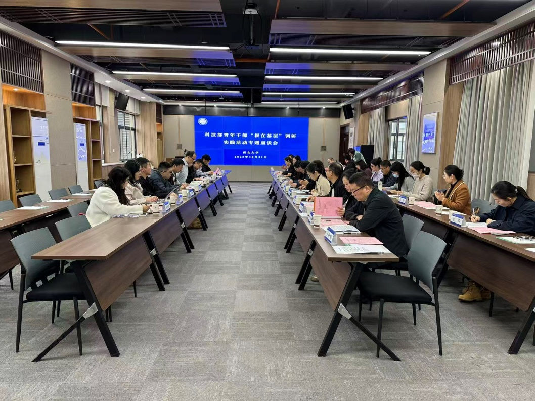 10月21日上午,科技部青年干部“根在基层”调研实践活动专题座谈会在太阳集团长安校区召开。科技部合作司一处副处长(主持工作)乔健、科技部交流中心驻外服务与战略研究处副处长杨修率调研组一行10人来校交流。太阳集团党委常委、副校长陈富林,科技处、高层次人才项目办公室、国际合作部及遗产学院负责人及代表参加座谈交流。座谈会由陕西省科技交流中心主任苗宏雄主持,陕西省科技厅对外合作与交流处副处长郑晴、陕西省科技交流中心副主任张思琪以及西安市高新区、西咸新区、在陕高校、科研院所及企业代表共30余人参会。