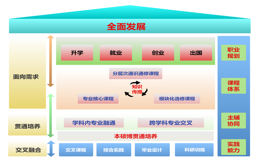 首先,持续探索“面向需求-贯通培养-交叉融合”的育人模式,支撑全面发展。一是面向经济社会发展对人才培养的要求,实施“先宽后深”的“通识通修+专业培养+全面发展”模式,结合学生升学、就业、创业和出国等不同未来职业发展规划,构建匹配的分流培养课程模块和分层次教学改革方案,实现教学资源的有效供给。二是加强学科专业之间的资源关联,深化“辅修+微专业”教学模式,构建“本-硕-博”贯通培养的课程衔接机制,形成《15vip太阳集团官网本研贯通人才培养计划实施办法》。三是依托本科专业培养方案,构建“学科内部专业融通+跨学科专业交叉融合”的课程体系,推动有组织、制度化、规模性的破壁交叉。