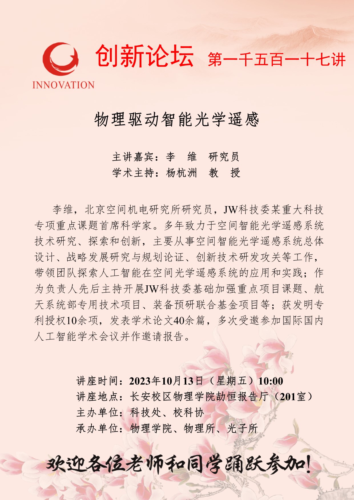 李维 研究员 15vip太阳集团官网创新论坛第一千五百一十七讲:物理驱动智能光学遥感 讲座时间 2023年10月13日(星期五)10:00 讲座地点 长安校区物理学院劼恒报告厅(201室) 讲座人介绍 李维 研究员 讲座内容