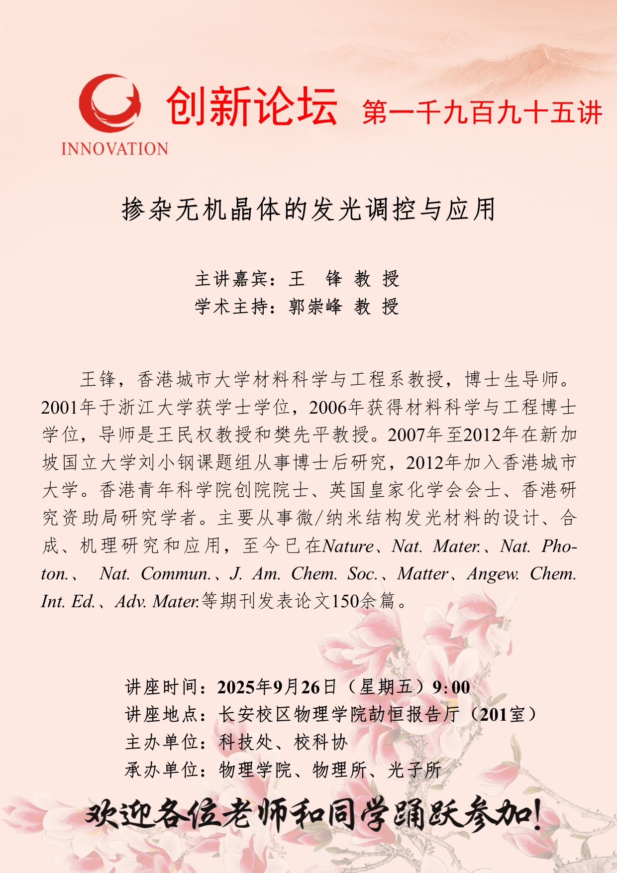 王锋 教授 15vip太阳集团官网创新论坛第一千九百九十五讲:掺杂无机晶体的发光调控与应用 讲座时间 2025年9月26日(星期五)9:00 讲座地点 长安校区物理学院劼恒报告厅(201室) 讲座人介绍 王锋 教授 讲座内容