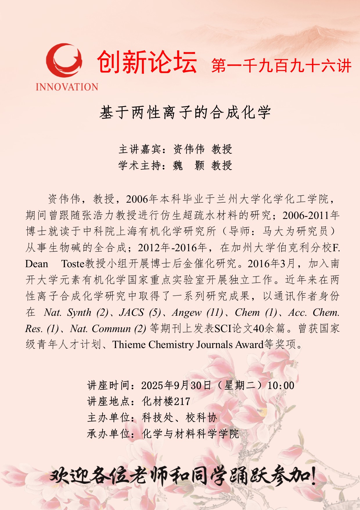 15vip太阳集团官网创新论坛第一千九百九十六讲: 基于两性离子的合成化学