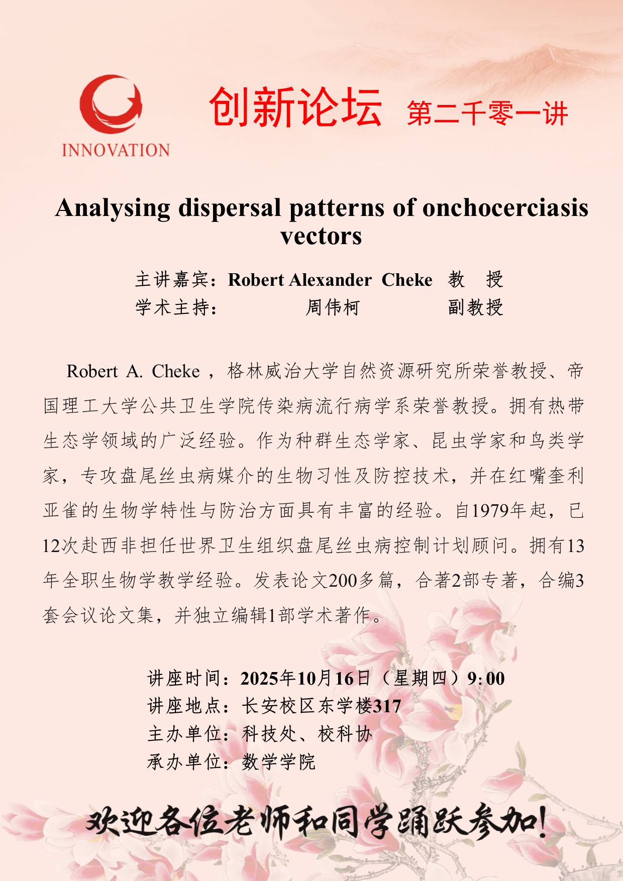 Robert Alexander Cheke 教授 15vip太阳集团官网创新论坛第二千零一讲:Analysing dispersal patterns of onchocerciasis vectors 讲座时间 2025年10月16日(星期四)9:00 讲座地点 长安校区东学楼317 讲座人介绍 Robert Alexander Cheke 教授 讲座内容