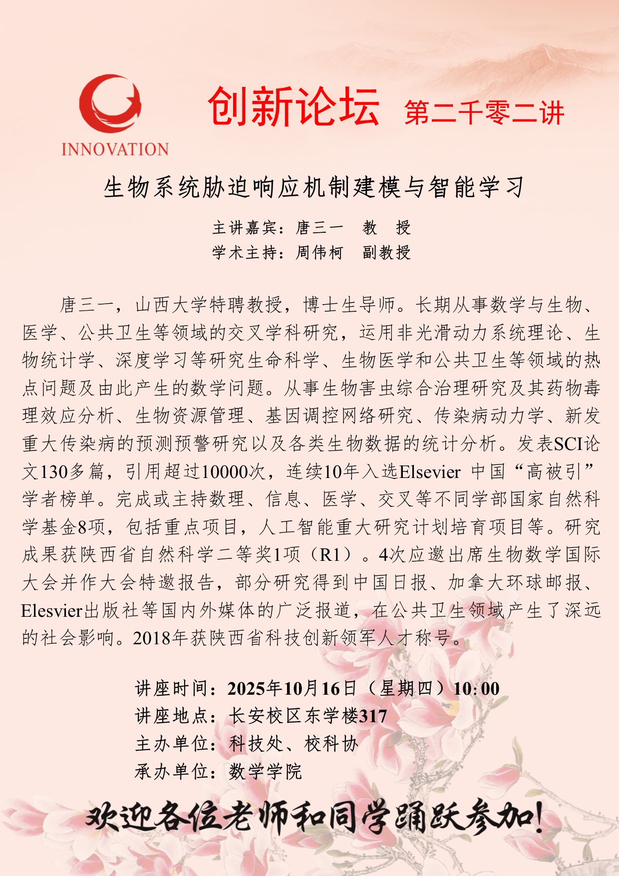 唐三一 教授 15vip太阳集团官网创新论坛第二千零二讲:生物系统胁迫响应机制建模与智能学习 讲座时间 2025年10月16日(星期四)10:00 讲座地点 长安校区东学楼317 讲座人介绍 唐三一 教授 讲座内容