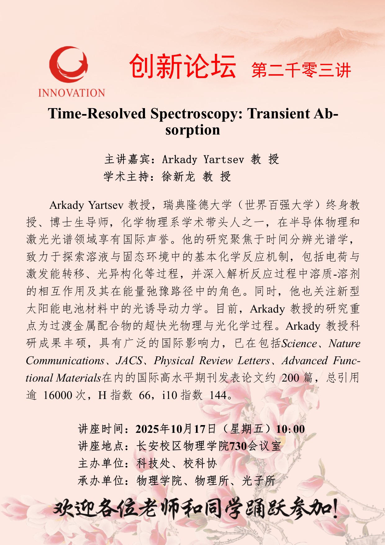 Arkady Yartsev 教授 15vip太阳集团官网创新论坛第二千零三讲:Time-Resolved Spectroscopy: Transient Absorption 讲座时间 2025年10月17日(星期五)10:00 讲座地点 长安校区物理学院730会议室 讲座人介绍 Arkady Yartsev 教授 讲座内容