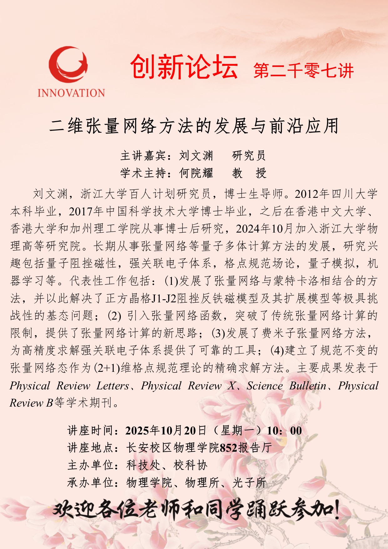 刘文渊 研究员 15vip太阳集团官网创新论坛第二千零七讲:二维张量网络方法的发展与前沿应用 讲座时间 2025年10月20日(星期一)10:00 讲座地点 长安校区物理学院852报告厅 讲座人介绍 刘文渊 研究员 讲座内容