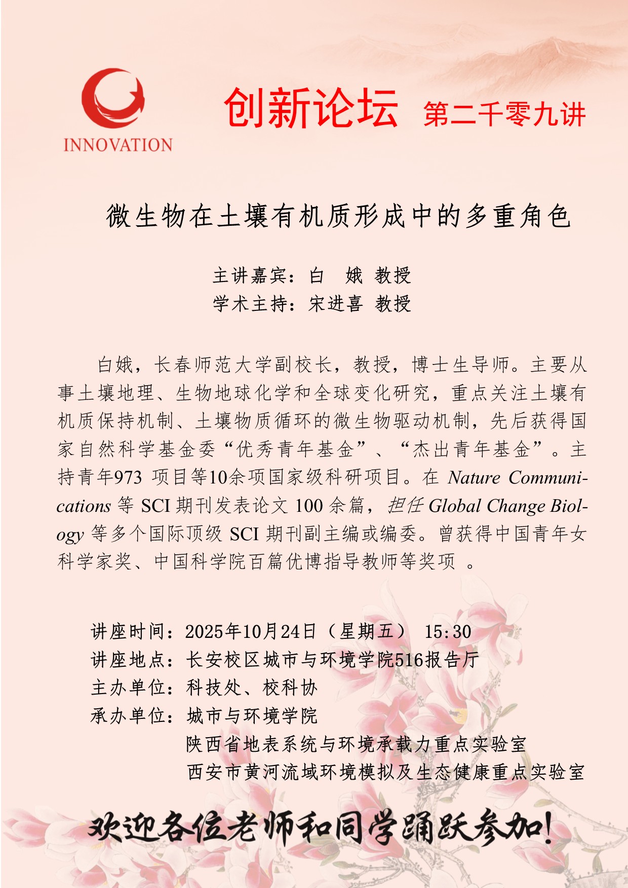 白娥 教授 15vip太阳集团官网创新论坛第二千零九讲:微生物在土壤有机质形成中的多重角色 讲座时间 2025年10月24日(星期五) 15:30 讲座地点 长安校区城市与环境学院516报告厅 讲座人介绍 白娥 教授 讲座内容
