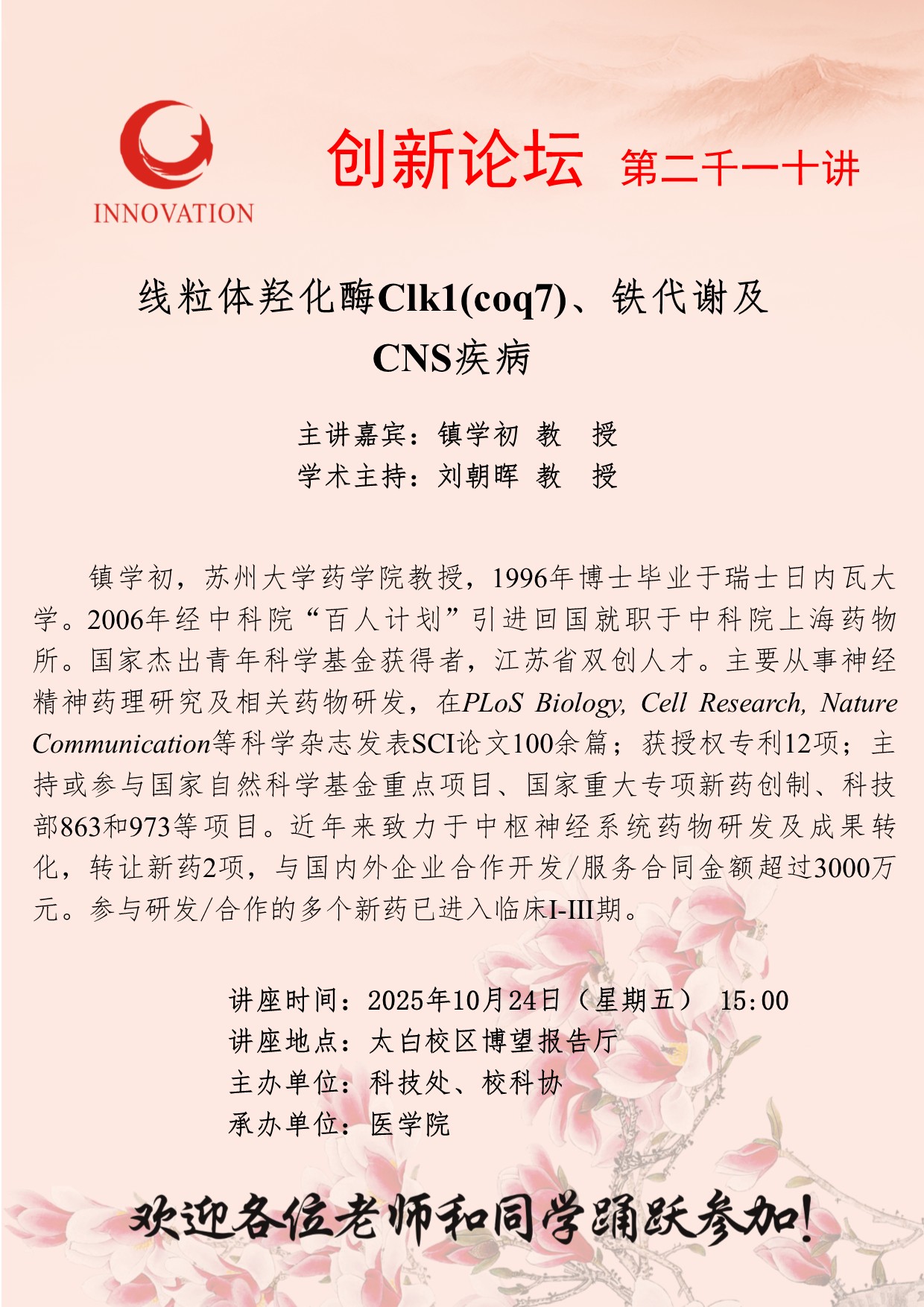 镇学初 教授 15vip太阳集团官网创新论坛第二千一十讲:线粒体羟化酶Clk1(coq7)、铁代谢及CNS疾病 讲座时间 2025年10月24日(星期五) 15:00 讲座地点 太白校区博望报告厅 讲座人介绍 镇学初 教授 讲座内容