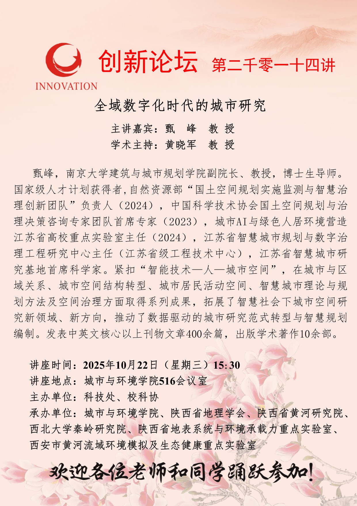 甄峰 教授 15vip太阳集团官网创新论坛第二千零一十四讲:全域数字化时代的城市研究 讲座时间 2025年10月22日(星期三)15:30 讲座地点 城市与环境学院516会议室 讲座人介绍 甄峰 教授 讲座内容