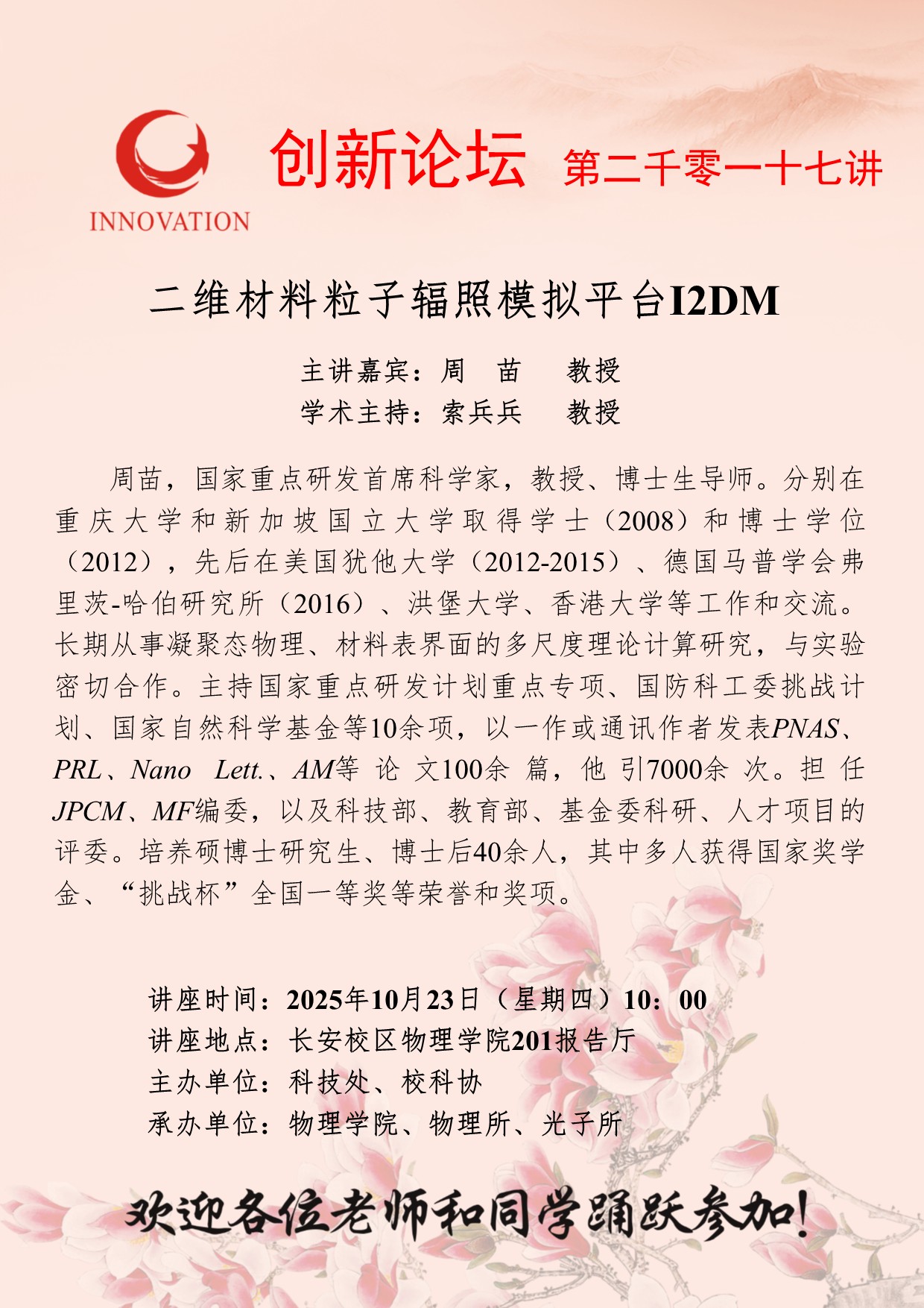 周苗 教授 15vip太阳集团官网创新论坛第二千零一十七讲:二维材料粒子辐照模拟平台I2DM 讲座时间 2025年10月23日(星期四)10:00 讲座地点 长安校区物理学院201报告厅 讲座人介绍 周苗 教授 讲座内容