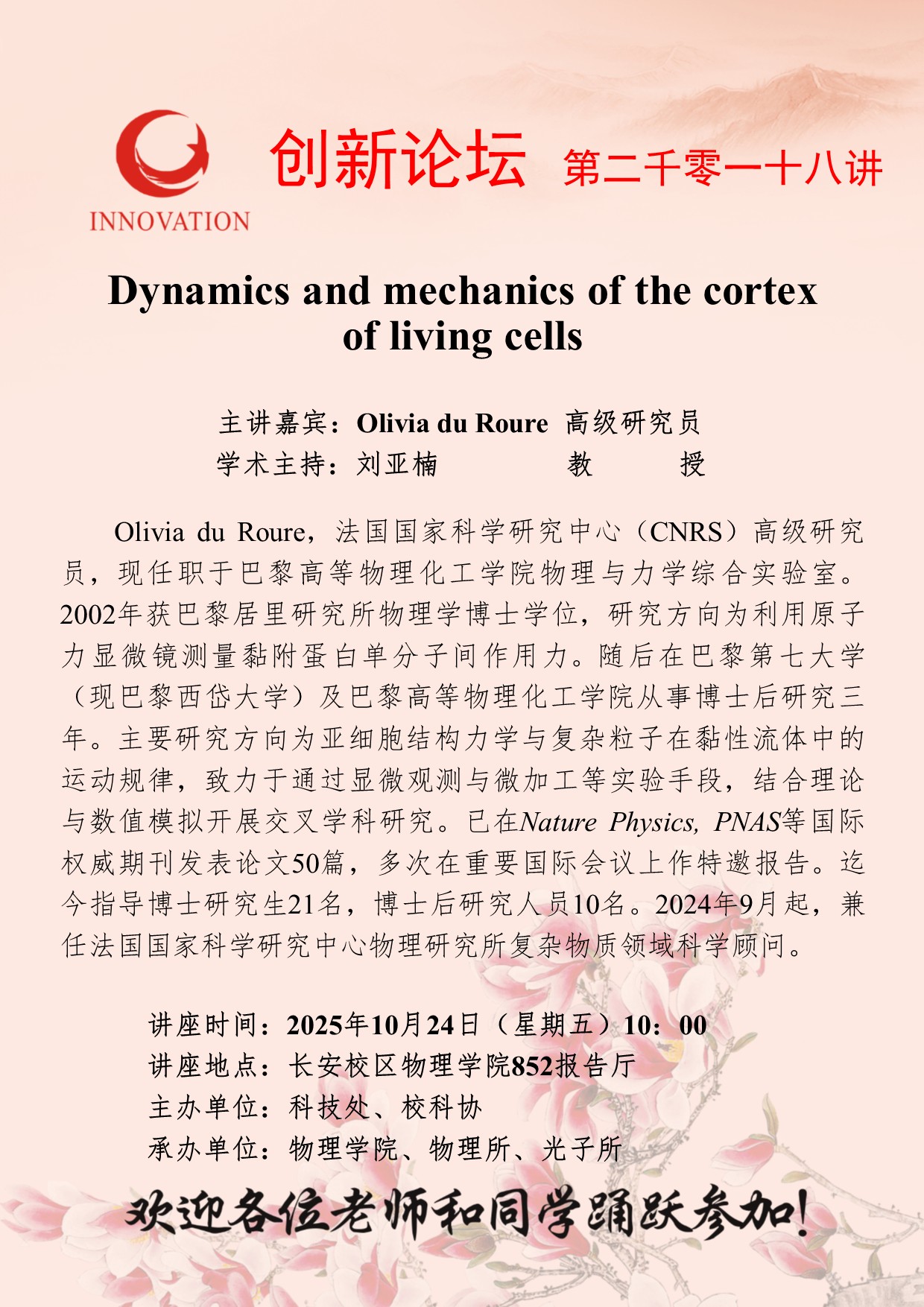 Olivia du Roure 高级研究员 15vip太阳集团官网创新论坛第二千零一十八讲:Dynamics and mechanics of the cortex of living cells 讲座时间 2025年10月24日(星期五)10:00 讲座地点 长安校区物理学院852报告厅 讲座人介绍 Olivia du Roure 高级研究员 讲座内容