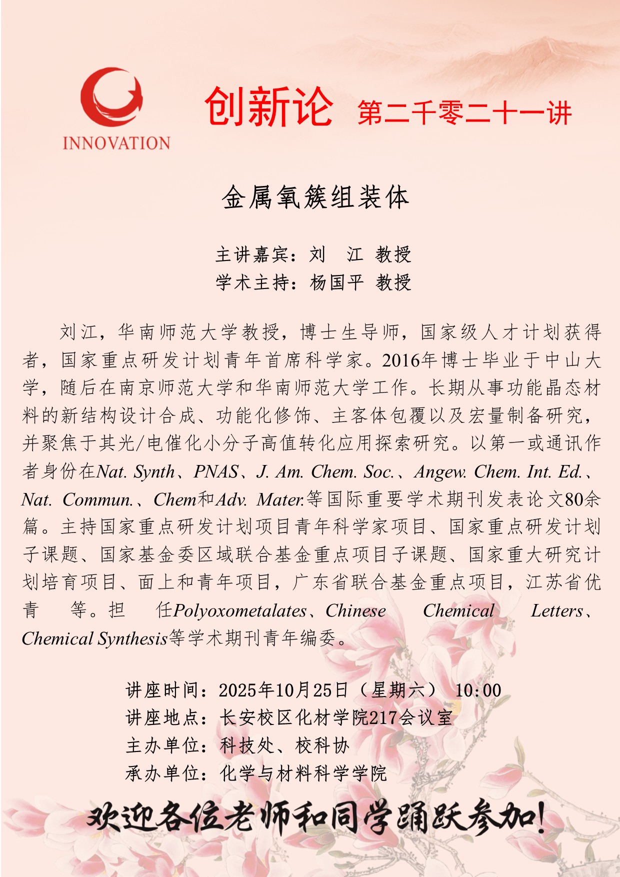 刘 江 教授 15vip太阳集团官网创新论坛第二千零二十一讲:金属氧簇组装体 讲座时间 2025年10月25日(星期六) 10:00 讲座地点 长安校区化材学院217会议室 讲座人介绍 刘 江 教授 讲座内容