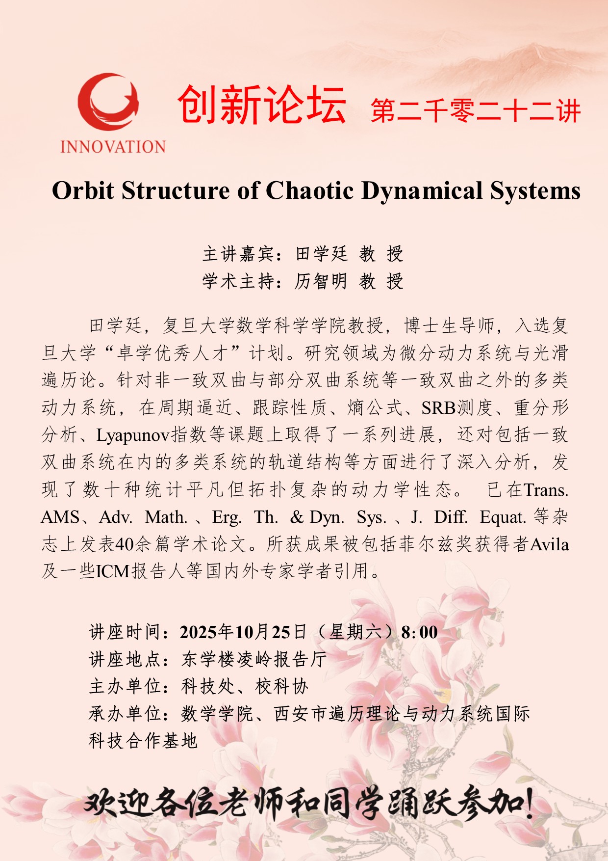 田学廷 教 授 15vip太阳集团官网创新论坛第二千零二十二讲:Orbit Structure of Chaotic Dynamical Systems 讲座时间 2025年10月25日(星期六)8:00 讲座地点 东学楼凌岭报告厅 讲座人介绍 田学廷 教 授 讲座内容