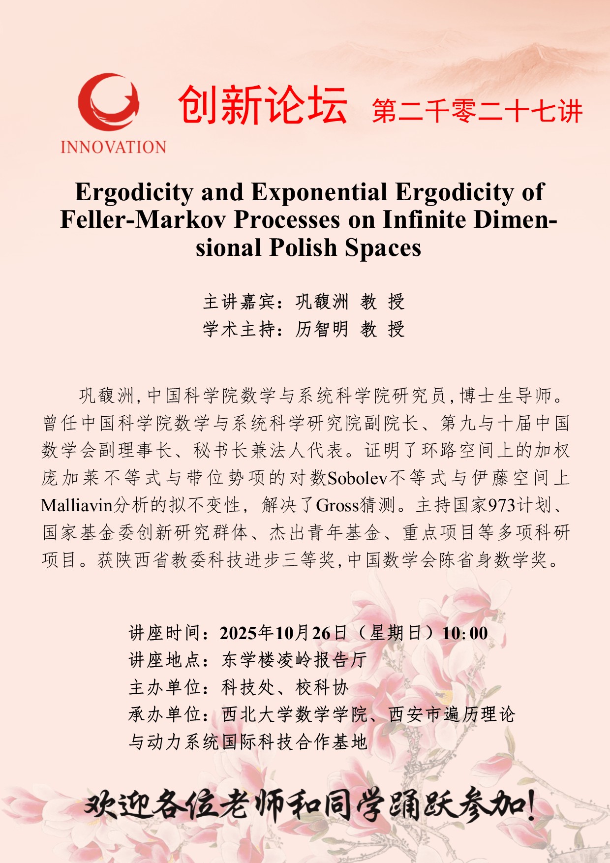 巩馥洲 教 授 15vip太阳集团官网创新论坛第二千零二十七讲:Ergodicity and Exponential Ergodicity of Feller-Markov Processes on Infinite Dimensional Polish Spaces 讲座时间 2025年10月26日(星期日)10:00 讲座地点 东学楼凌岭报告厅 讲座人介绍 巩馥洲 教 授 讲座内容