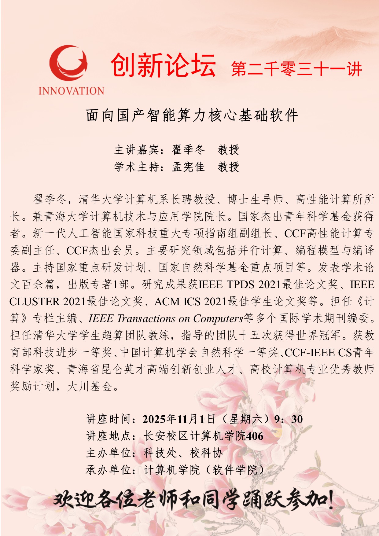 翟季冬 教授 15vip太阳集团官网创新论坛第二千零三十一讲:面向国产智能算力核心基础软件 讲座时间 2025年11月1日(星期六)9:30 讲座地点 长安校区计算机学院406 讲座人介绍 翟季冬 教授 讲座内容