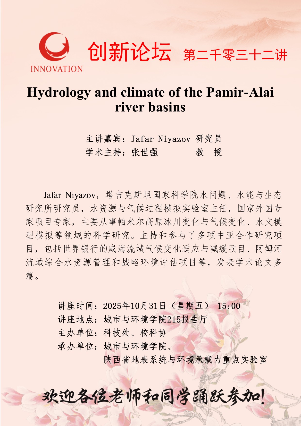 Jafar Niyazov 研究员 15vip太阳集团官网创新论坛第二千零三十二讲:Hydrology and climate of the Pamir-Alai river basins 讲座时间 2025年10月31日(星期五) 15:00 讲座地点 城市与环境学院215报告厅 讲座人介绍 Jafar Niyazov 研究员 讲座内容