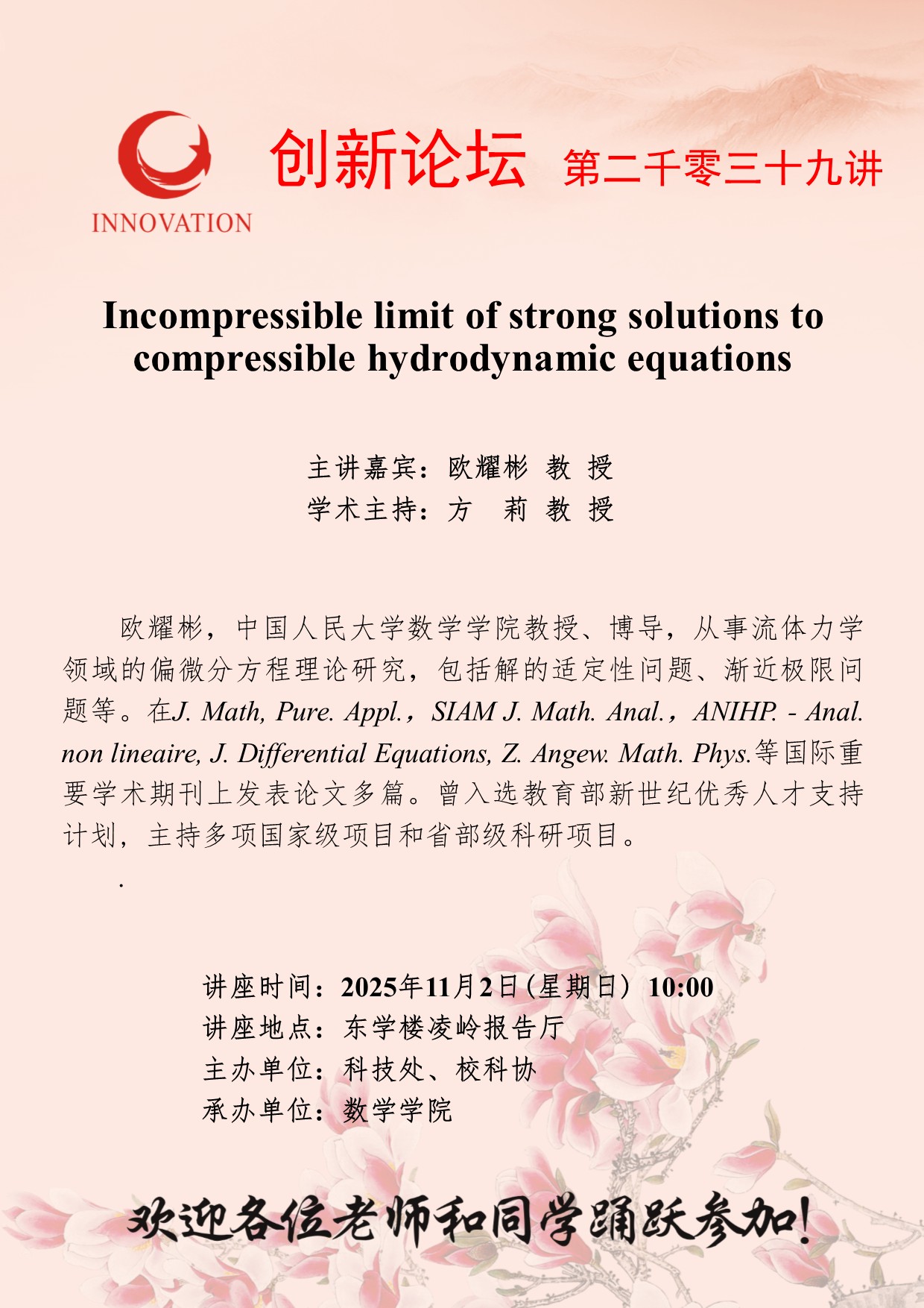 欧耀彬 教 授 15vip太阳集团官网创新论坛第二千零三十九讲:Incompressible limit of strong solutions to compressible hydrodynamic equations 讲座时间 2025年11月2日(星期日) 10:00 讲座地点 东学楼凌岭报告厅 讲座人介绍 欧耀彬 教 授 讲座内容
