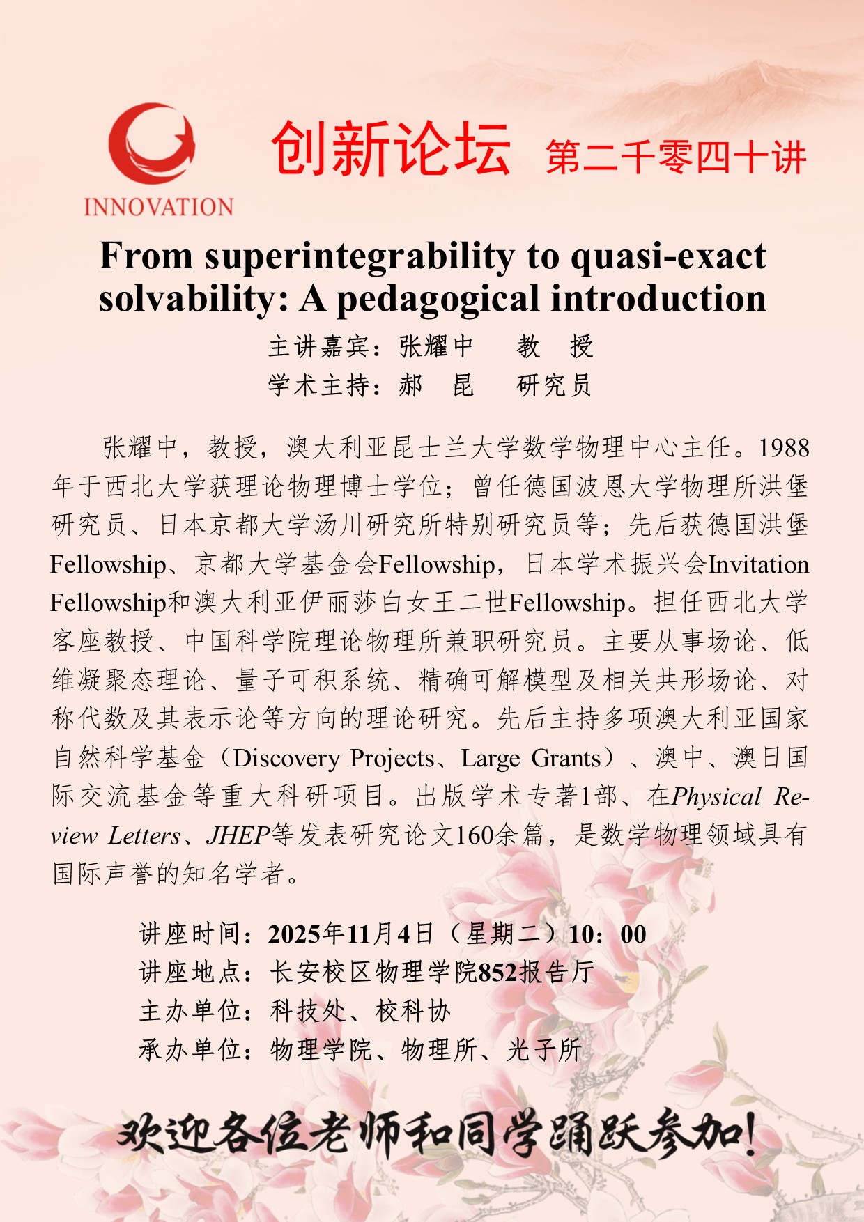 张耀中 教授 15vip太阳集团官网创新论坛第二千零四十讲:From superintegrability to quasi-exact solvability: A pedagogical introduction 讲座时间 2025年11月4日(星期二)10:00 讲座地点 长安校区物理学院852报告厅 讲座人介绍 张耀中 教授 讲座内容