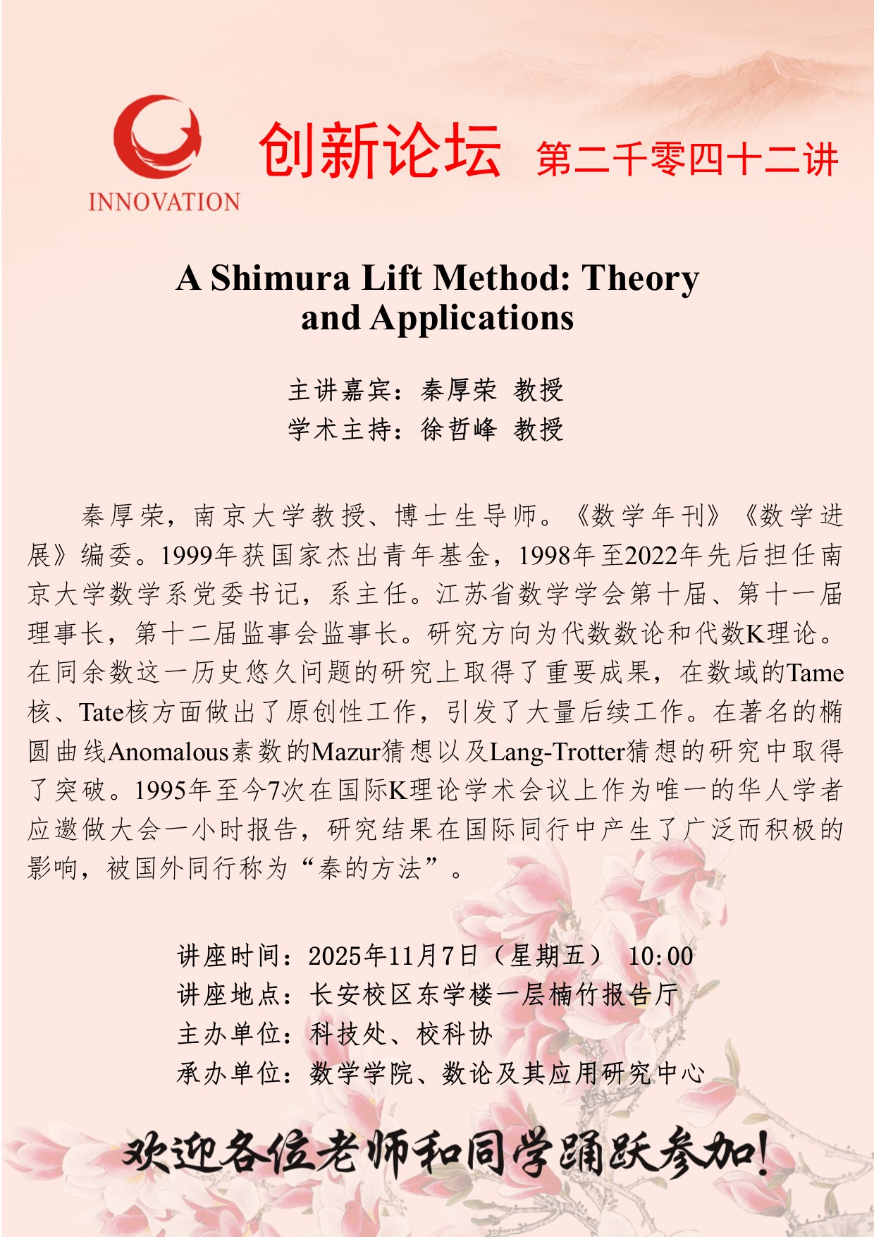 秦厚荣 教授 15vip太阳集团官网创新论坛第二千零四十二讲:A Shimura Lift Method: Theory and Applications 讲座时间 2025年11月7日(星期五) 10:00 讲座地点 长安校区东学楼一层楠竹报告厅 讲座人介绍 秦厚荣 教授 讲座内容