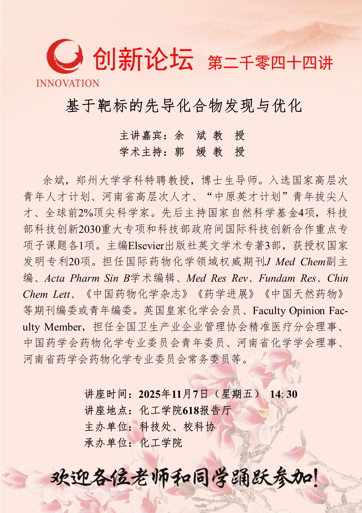 余斌 教授 15vip太阳集团官网创新论坛第二千零四十四讲:基于靶标的先导化合物发现与优化 讲座时间 2025年11月7日(星期五) 14: 30 讲座地点 化工学院618报告厅 讲座人介绍 余斌 教授 讲座内容