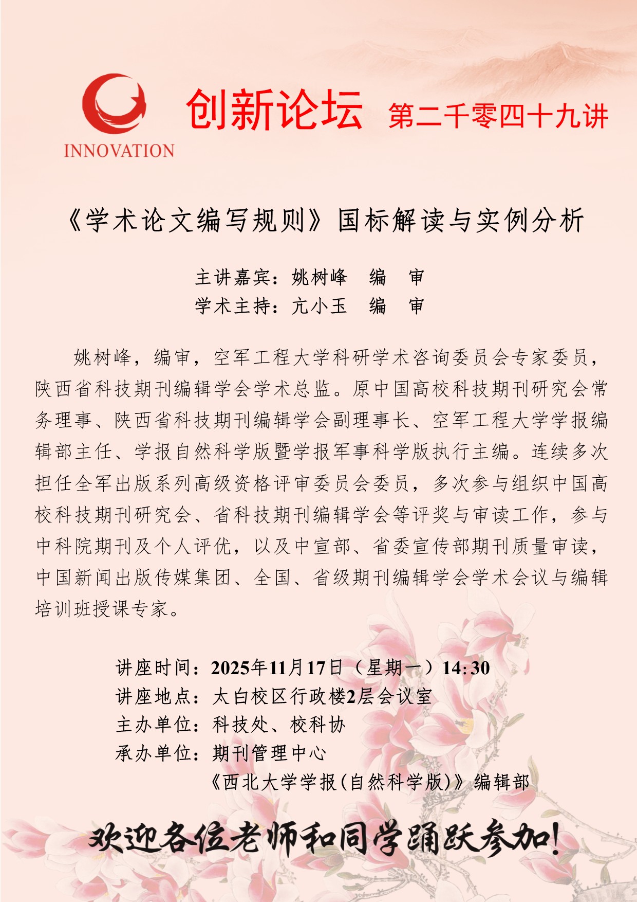 姚树峰 编审 15vip太阳集团官网创新论坛第二千零四十九讲:《学术论文编写规则》国标解读与实例分析 讲座时间 2025年11月17日(星期一)14:30 讲座地点 太白校区行政楼2层会议室 讲座人介绍 姚树峰 编审 讲座内容
