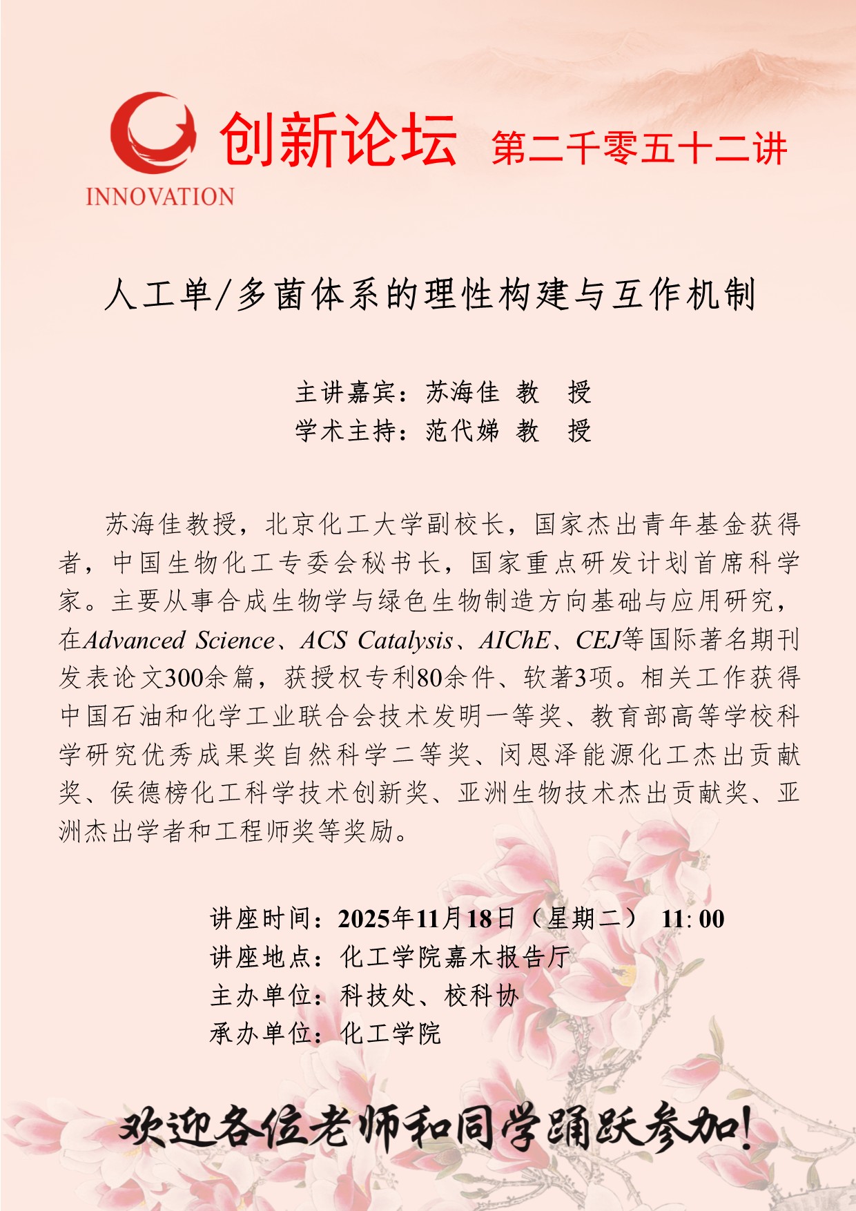 苏海佳 教授 15vip太阳集团官网创新论坛第二千零五十二讲:人工单/多菌体系的理性构建与互作机制 讲座时间 2025年11月18日(星期二) 11: 00 讲座地点 化工学院嘉木报告厅 讲座人介绍 苏海佳 教授 讲座内容