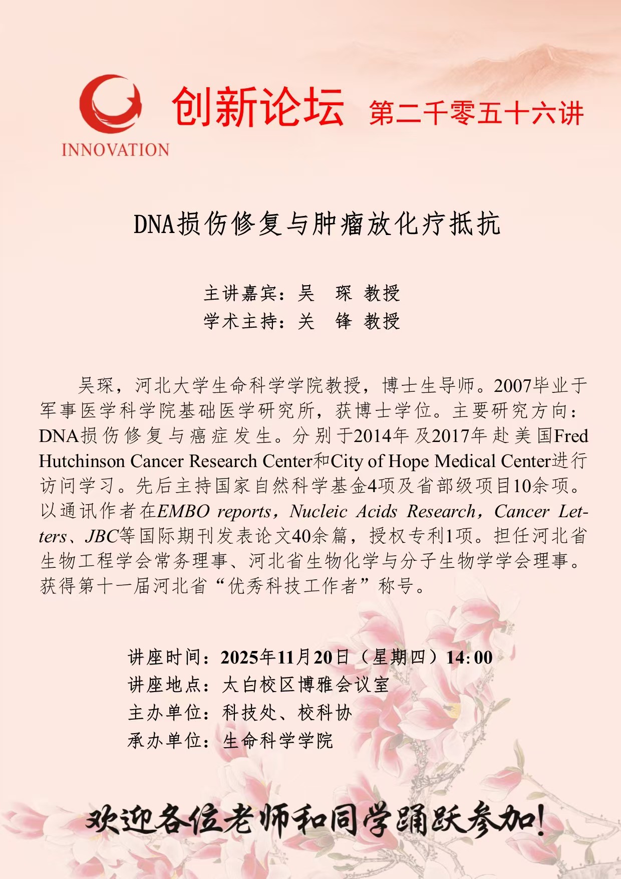 吴琛 教授 15vip太阳集团官网创新论坛第二千零五十六讲:DNA损伤修复与肿瘤放化疗抵抗 讲座时间 2025年11月20日(星期四)14:00 讲座地点 太白校区博雅会议室 讲座人介绍 吴琛 教授 讲座内容