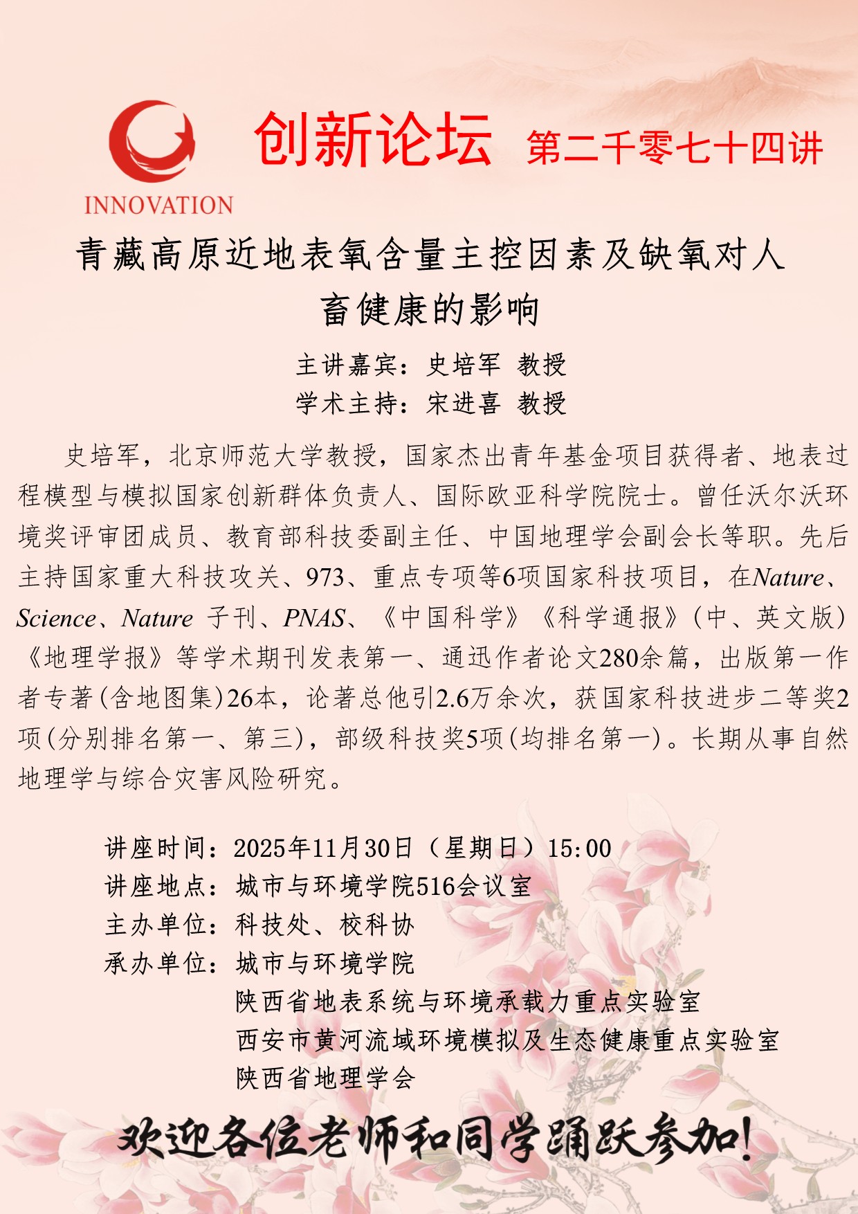 史培军 教授 15vip太阳集团官网创新论坛第二千零七十四讲:青藏高原近地表氧含量主控因素及缺氧对人畜健康的影响 讲座时间 2025年11月30日(星期日)15:00 讲座地点 城市与环境学院516会议室 讲座人介绍 史培军 教授 讲座内容
