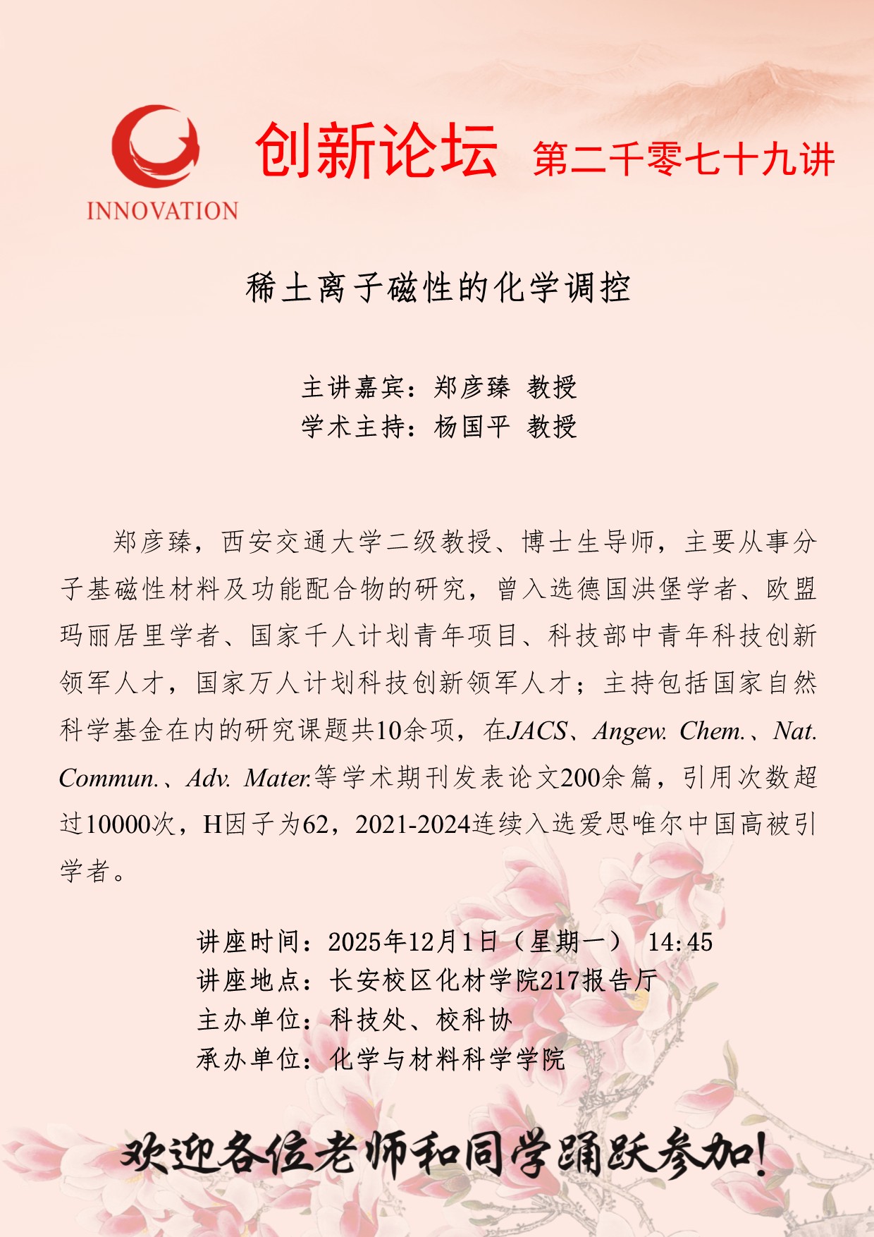 郑彦臻 教授 15vip太阳集团官网创新论坛第二千零七十九讲:稀土离子磁性的化学调控 讲座时间 2025年12月1日(星期一) 14:45 讲座地点 长安校区化材学院217报告厅 讲座人介绍 郑彦臻 教授 讲座内容