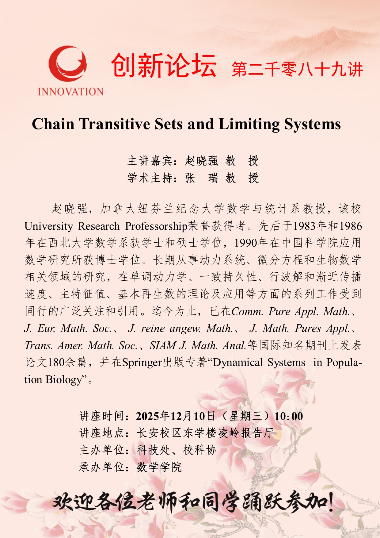 赵晓强 教授 15vip太阳集团官网创新论坛第二千零八十九讲:Chain Transitive Sets and Limiting Systems 讲座时间 2025年12月10日(星期三)10:00 讲座地点 长安校区东学楼凌岭报告厅 讲座人介绍 赵晓强 教授 讲座内容