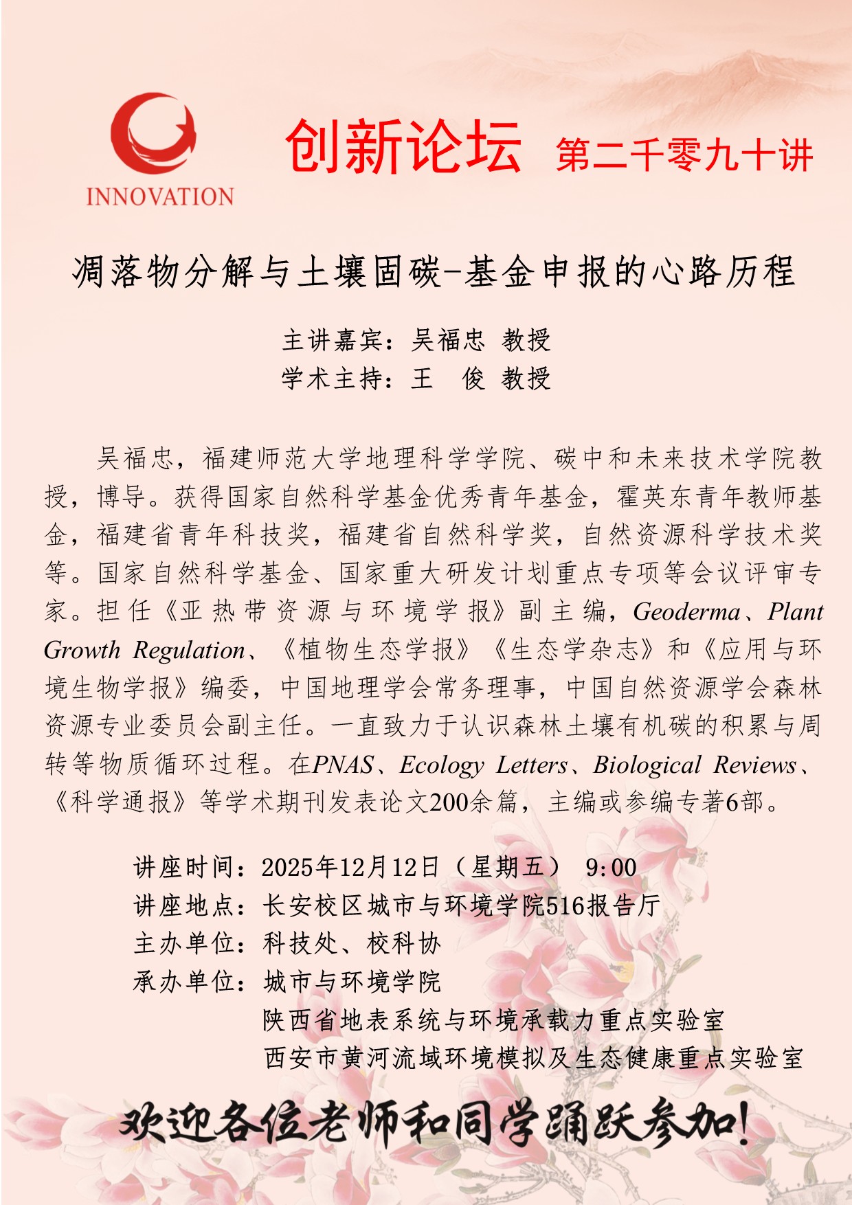 吴福忠 教授 15vip太阳集团官网创新论坛第二千零九十讲:凋落物分解与土壤固碳-基金申报的心路历程 讲座时间 2025年12月12日(星期五) 9:00 讲座地点 长安校区城市与环境学院516报告厅 讲座人介绍 吴福忠 教授 讲座内容