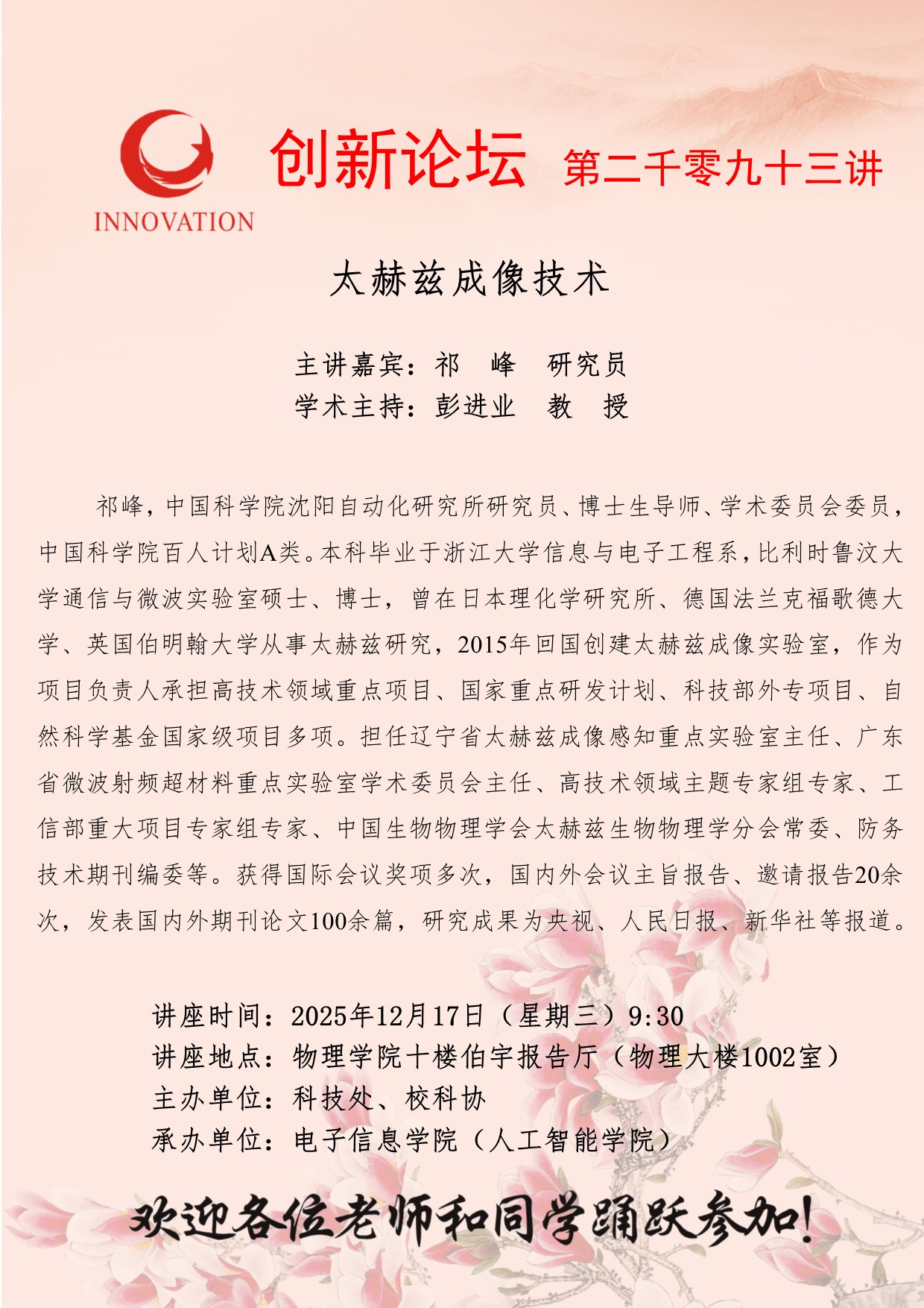 祁峰 研究员 15vip太阳集团官网创新论坛第二千零九十三讲:太赫兹成像技术 讲座时间 2025年12月17日(星期三)9:30 讲座地点 物理学院十楼伯宇报告厅(物理大楼1002室) 讲座人介绍 祁峰 研究员 讲座内容
