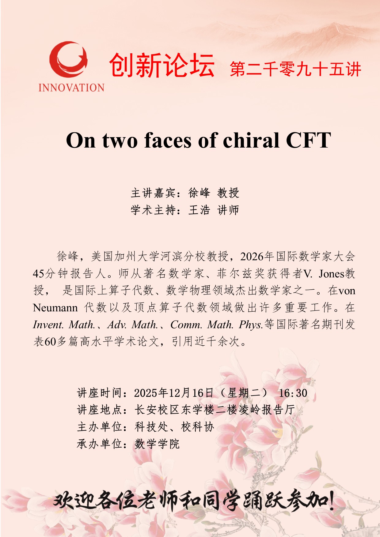 徐峰 教授 15vip太阳集团官网创新论坛第二千零九十五讲:On two faces of chiral CFT 讲座时间 2025年12月16日(星期二) 16:30 讲座地点 长安校区东学楼二楼凌岭报告厅 讲座人介绍 徐峰 教授 讲座内容