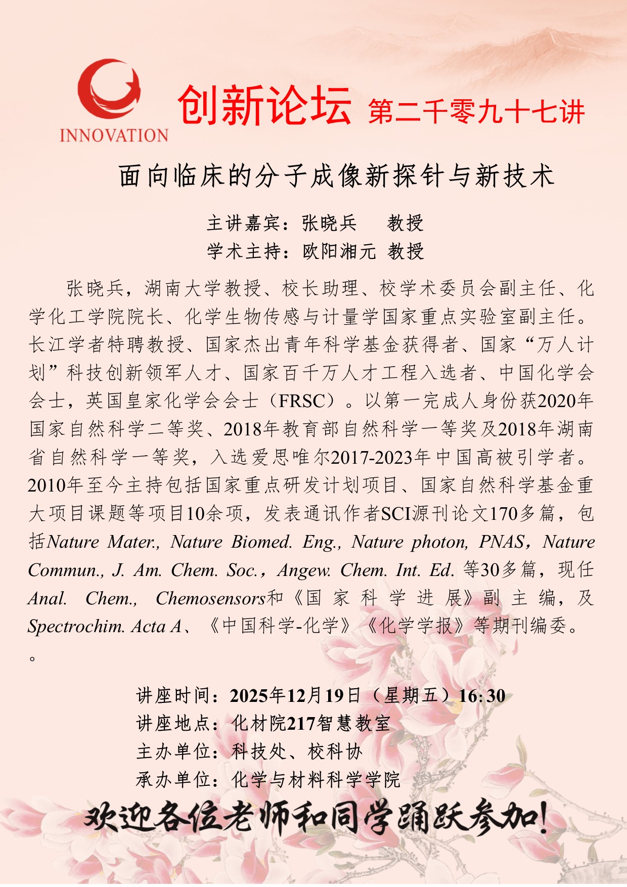 张晓兵 教授 15vip太阳集团官网创新论坛第二千零九十七讲:面向临床的分子成像新探针与新技术 讲座时间 2025年12月19日(星期五)16:30 讲座地点 化材院217智慧教室 讲座人介绍 张晓兵 教授 讲座内容