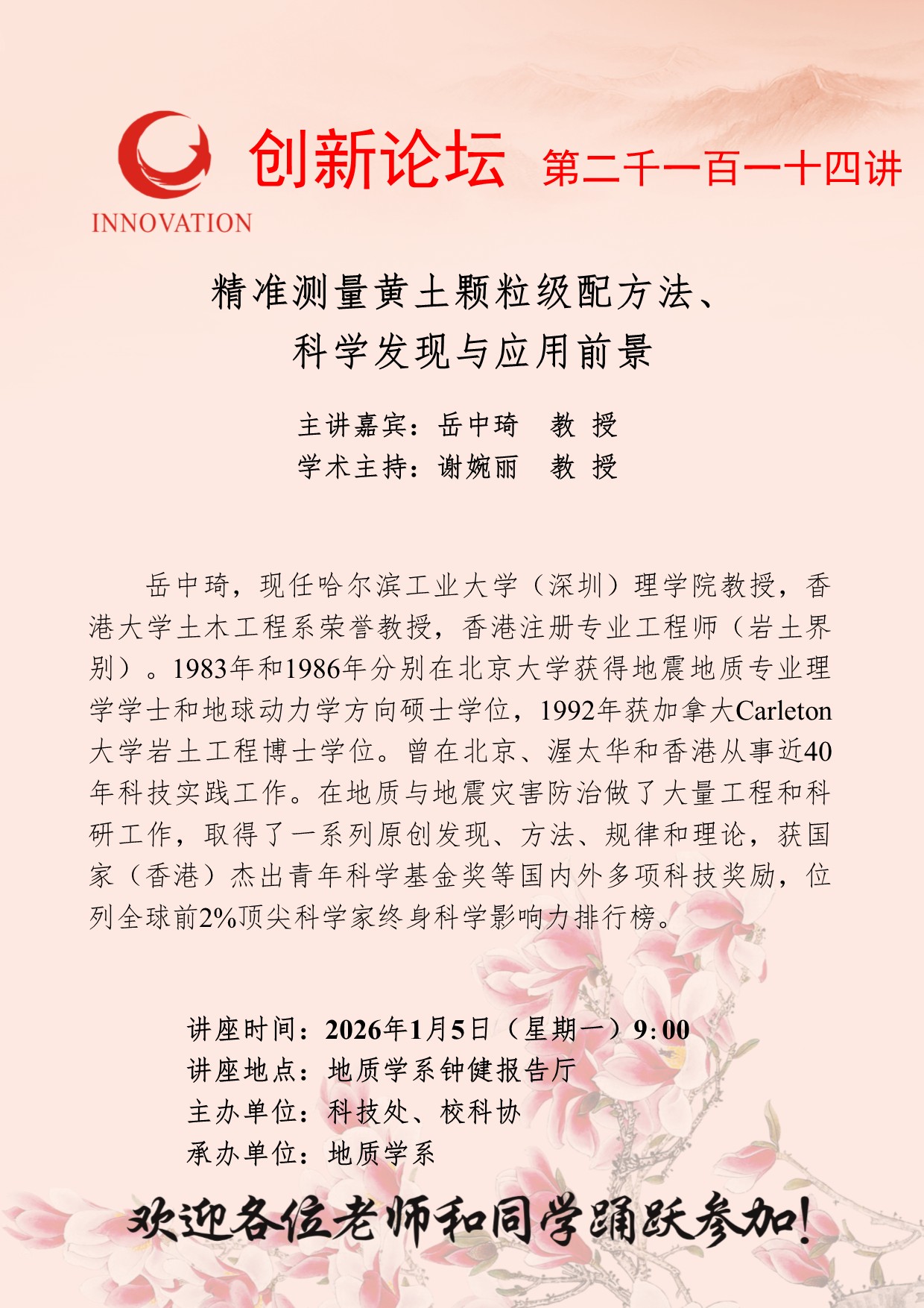 岳中琦 教授 15vip太阳集团官网创新论坛第二千一百一十四讲:精准测量黄土颗粒级配方法、 科学发现与应用前景 讲座时间 2026年1月5日(星期一)9:00 讲座地点 地质学系钟健报告厅 讲座人介绍 岳中琦 教授 讲座内容