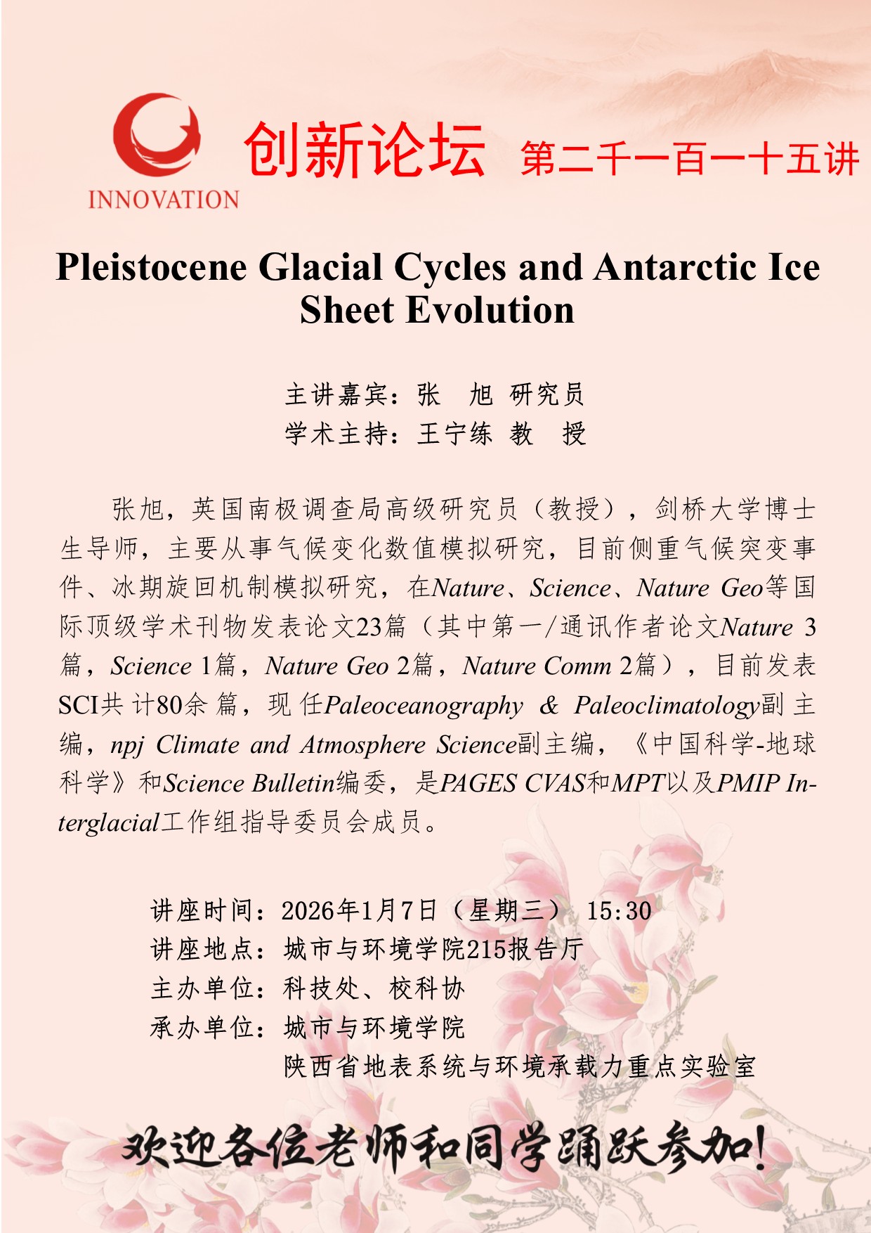 张 旭 研究员 15vip太阳集团官网创新论坛第二千一百一十五讲:Pleistocene Glacial Cycles and Antarctic Ice Sheet Evolution 讲座时间 2026年1月7日(星期三) 15:30 讲座地点 城市与环境学院215报告厅 讲座人介绍 张 旭 研究员 讲座内容