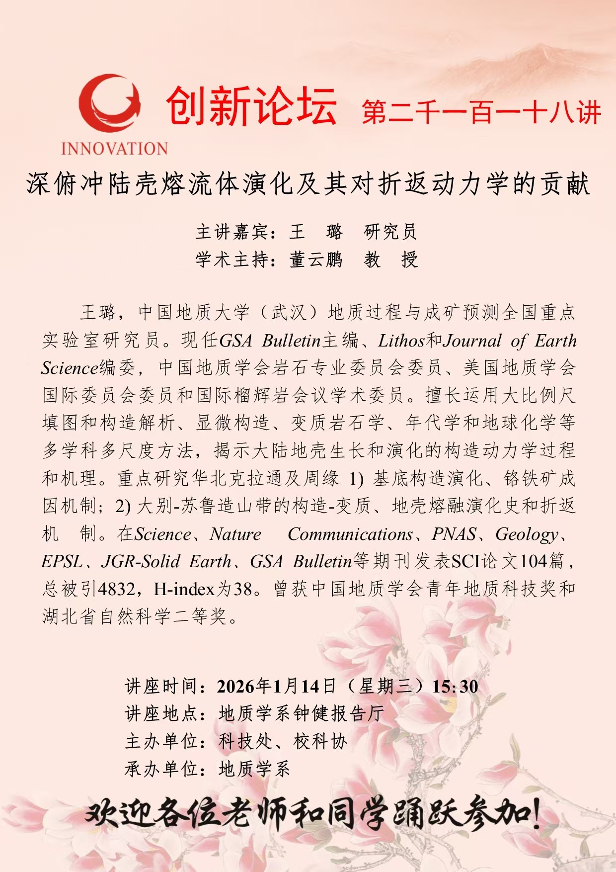 王 璐 研究员 15vip太阳集团官网创新论坛第二千一百一十八讲:深俯冲陆壳熔流体演化及其对折返动力学的贡献 讲座时间 2026年1月14日(星期三)15:30 讲座地点 地质学系钟健报告厅 讲座人介绍 王 璐 研究员 讲座内容