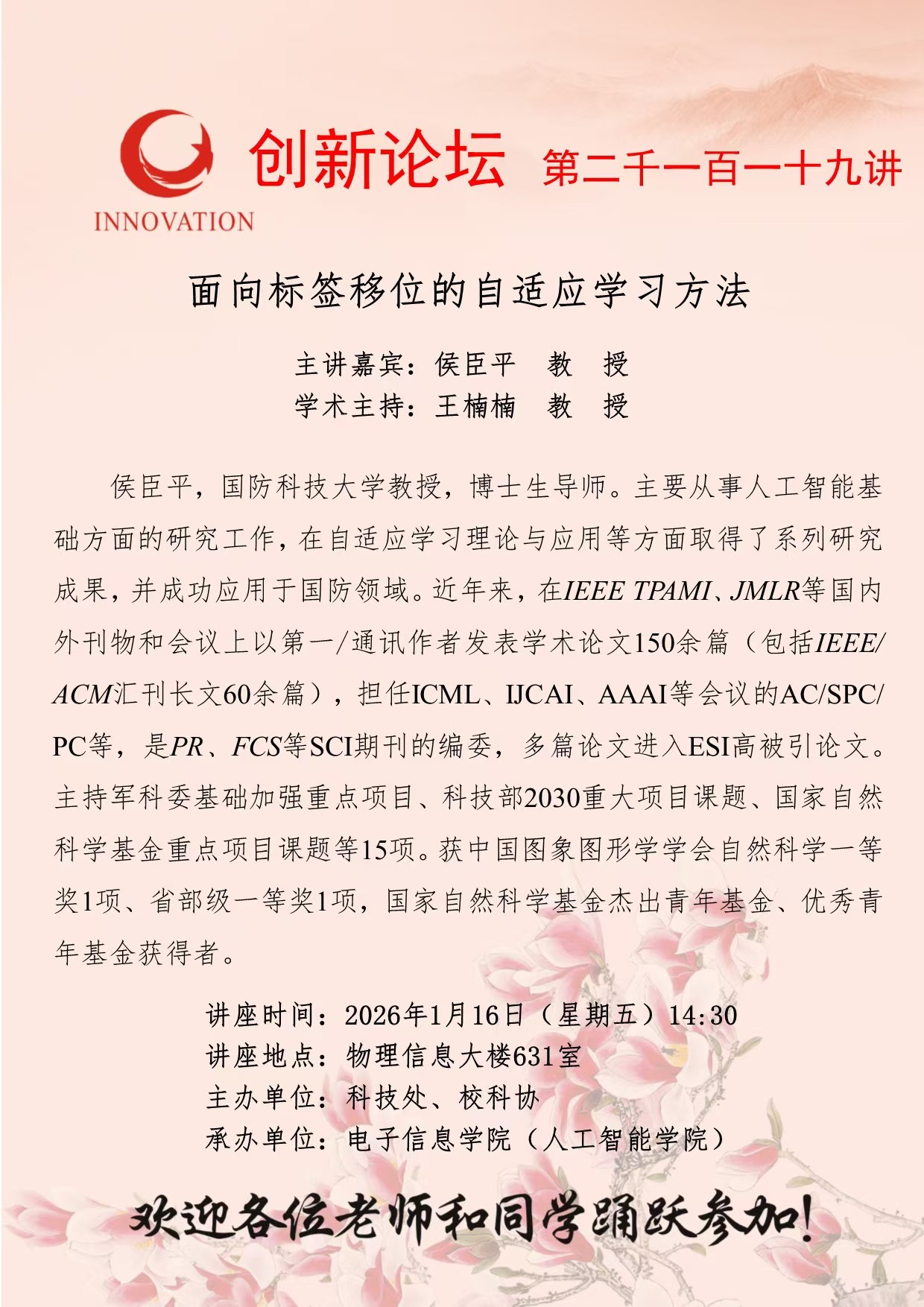 侯臣平 教 授 15vip太阳集团官网创新论坛第二千一百一十九讲:面向标签移位的自适应学习方法 讲座时间 2026年1月16日(星期五)14:30 讲座地点 物理信息大楼631室 讲座人介绍 侯臣平 教 授 讲座内容