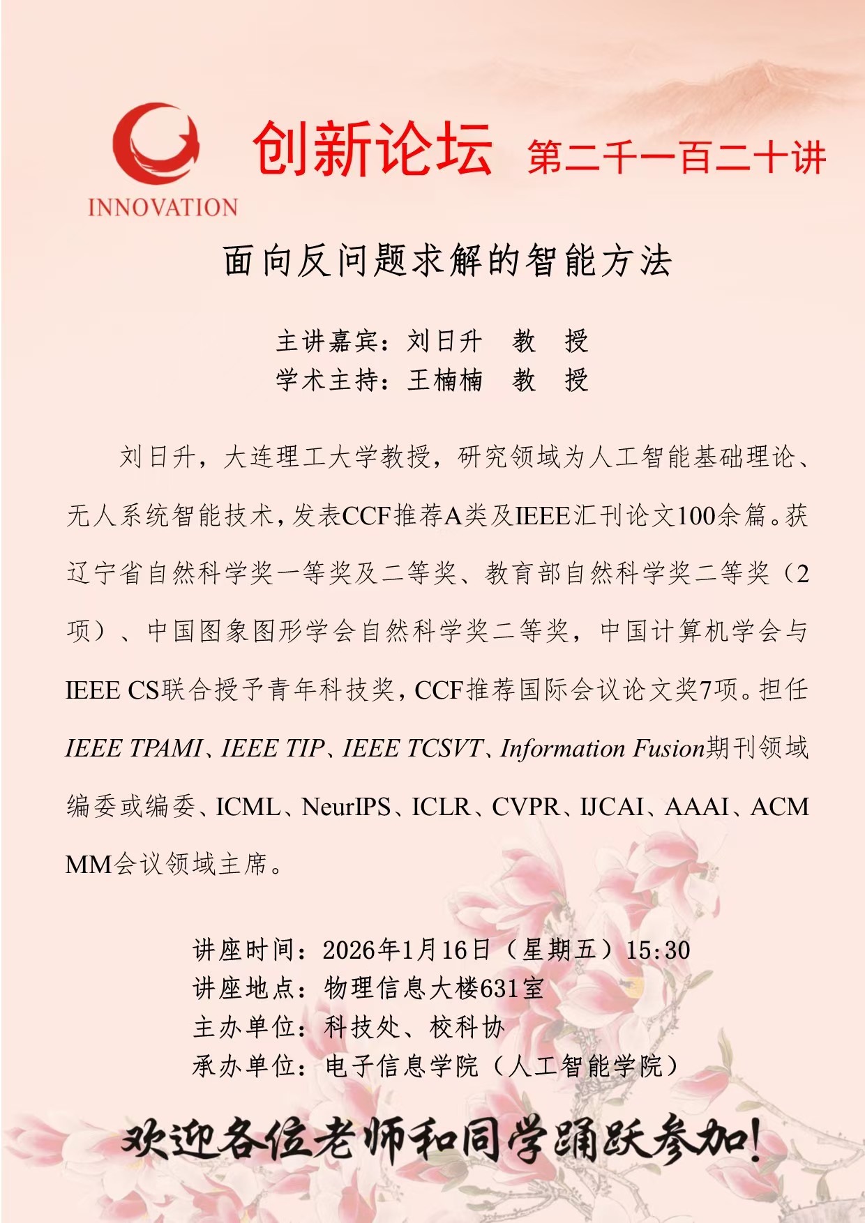 刘日升 教 授 15vip太阳集团官网创新论坛第二千一百二十讲:面向反问题求解的智能方法 讲座时间 2026年1月16日(星期五)15:30 讲座地点 物理信息大楼631室 讲座人介绍 刘日升 教 授 讲座内容
